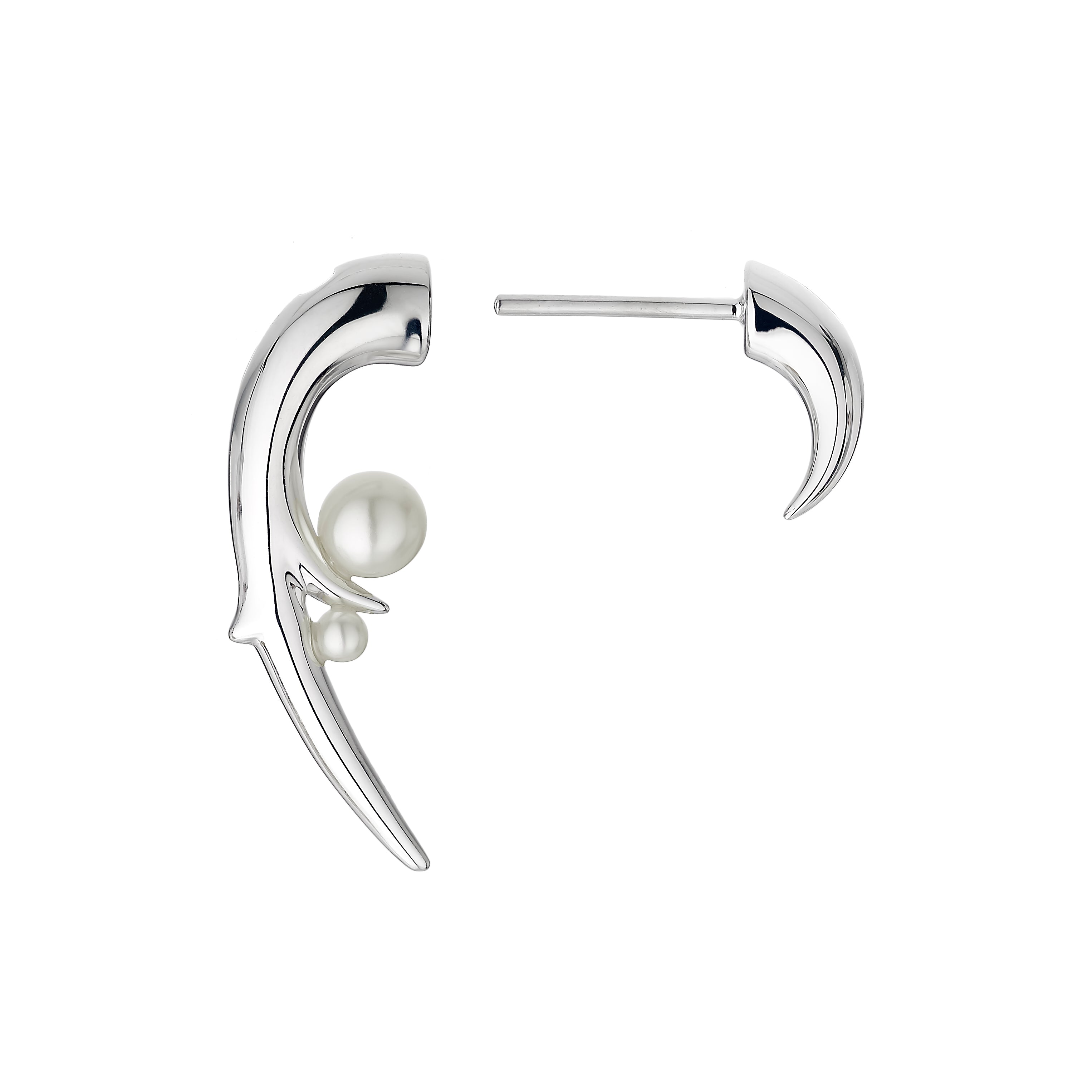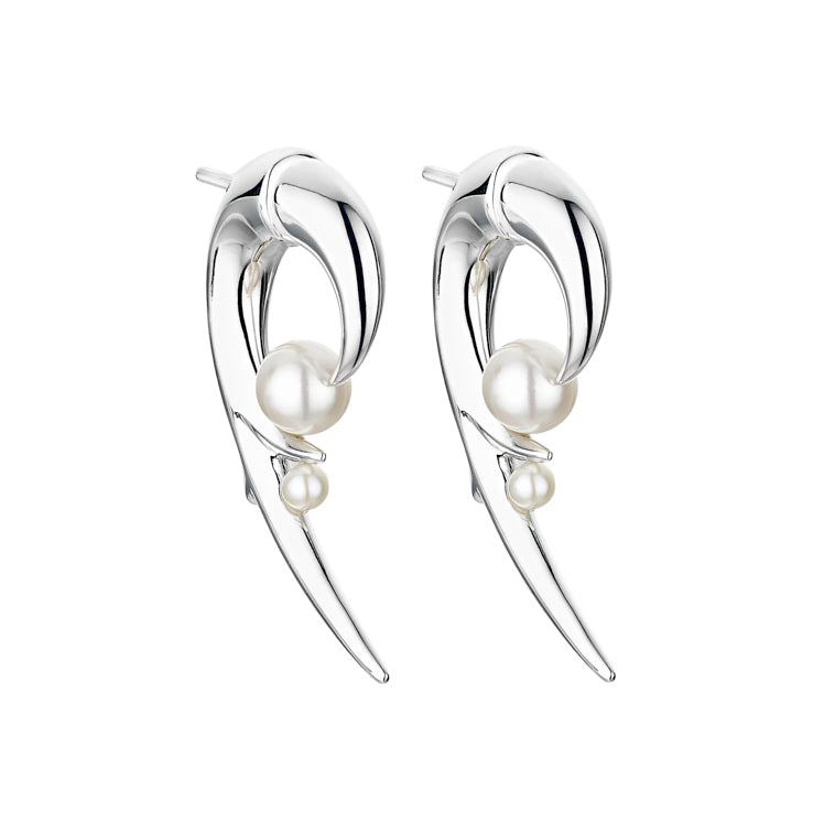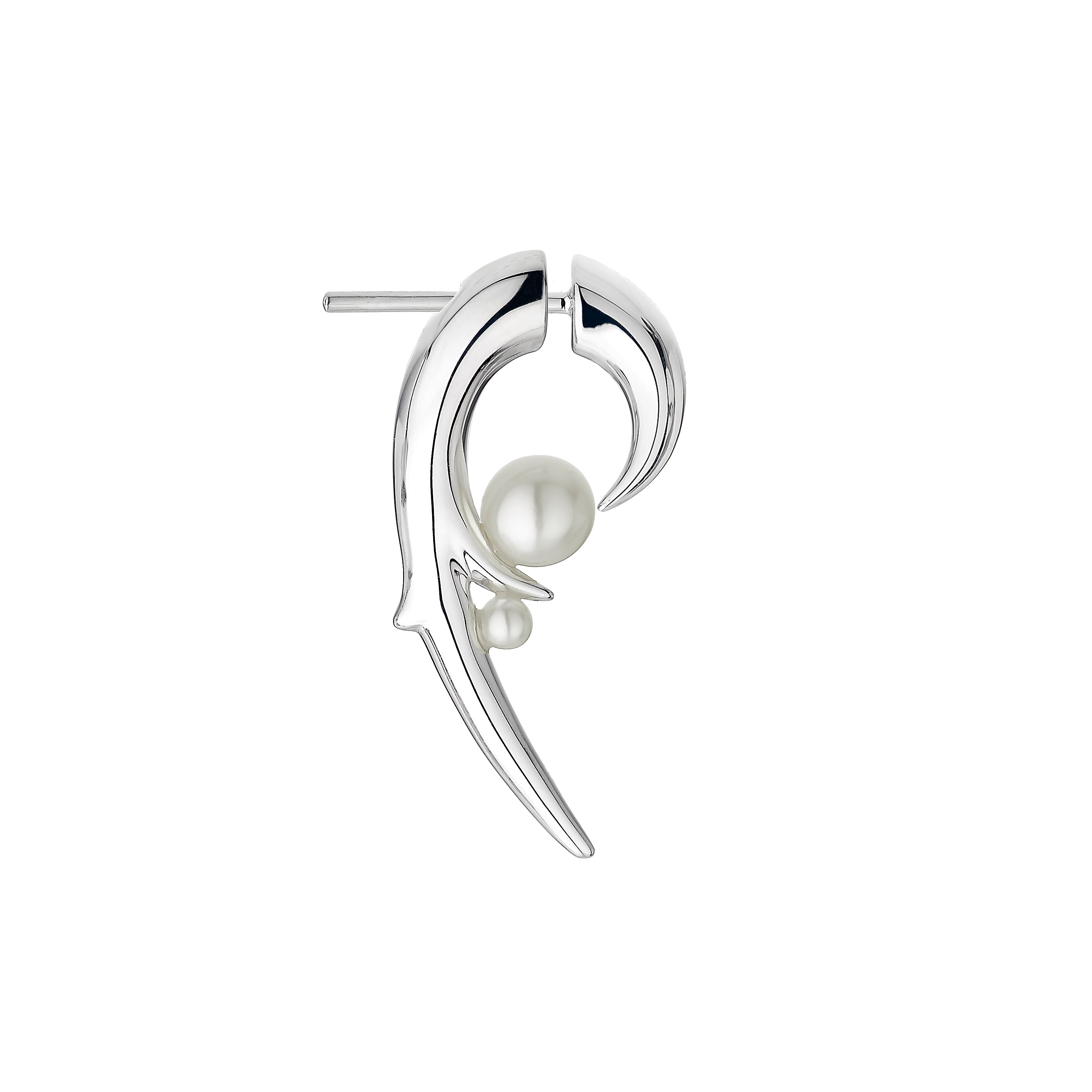 Handcrafted from sterling silver, a large freshwater pearl and a small freshwater pearl, our Hooked Pearl Earrings are our elevated take on classic silver hooped earrings. Inspired by Leane's barbed silver tusks from the Alexander McQueen runways of the 1990s, the Hooked Pearl silhouette defies tradition - curled, curvilinear, generous - making freshwater pearls the centre of attention. Flawless, face-framing sterling silver hooks pierce the lobe, encasing precious, organic material. A combination of hard and soft, their sleek minimalism is synonymous with the House of Shaun Leane, shifting our perception of the classic pearl earring. Each Hooked Pearl earring is perfected through 360 degrees, with a delicate drop of 26mm.