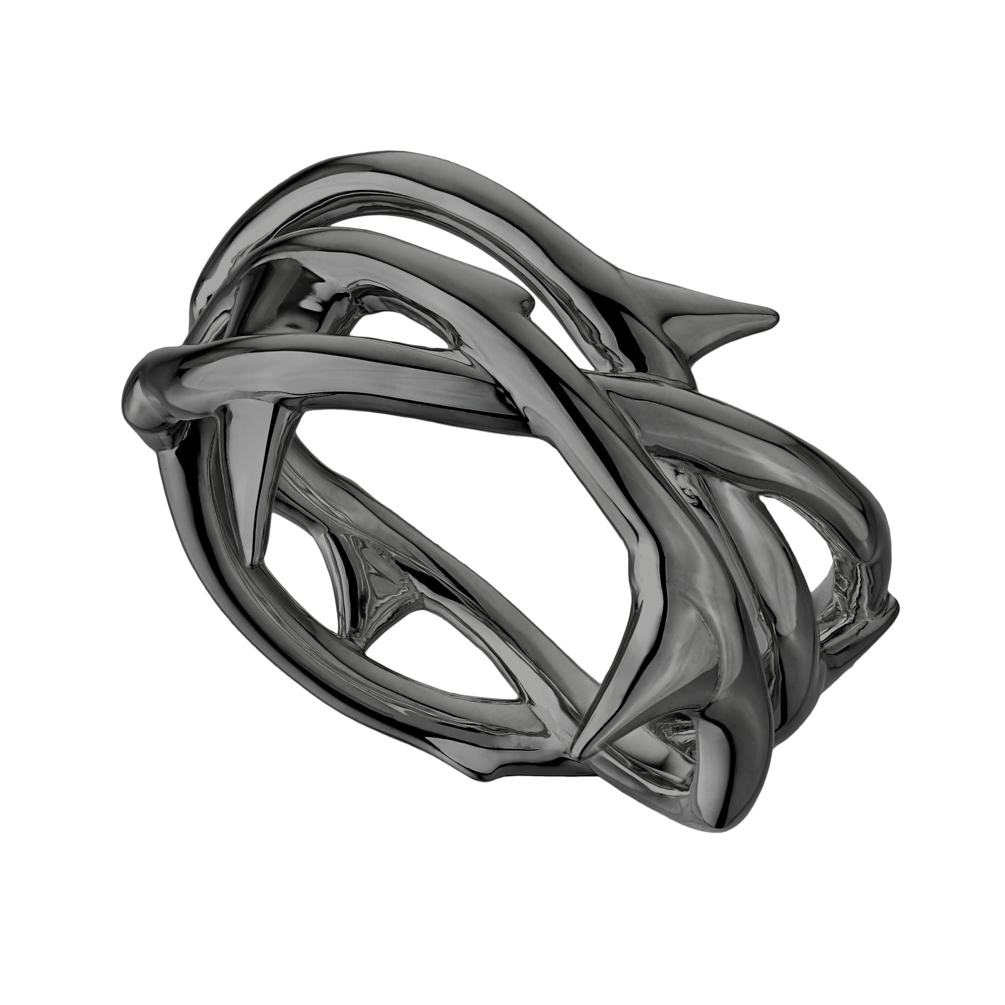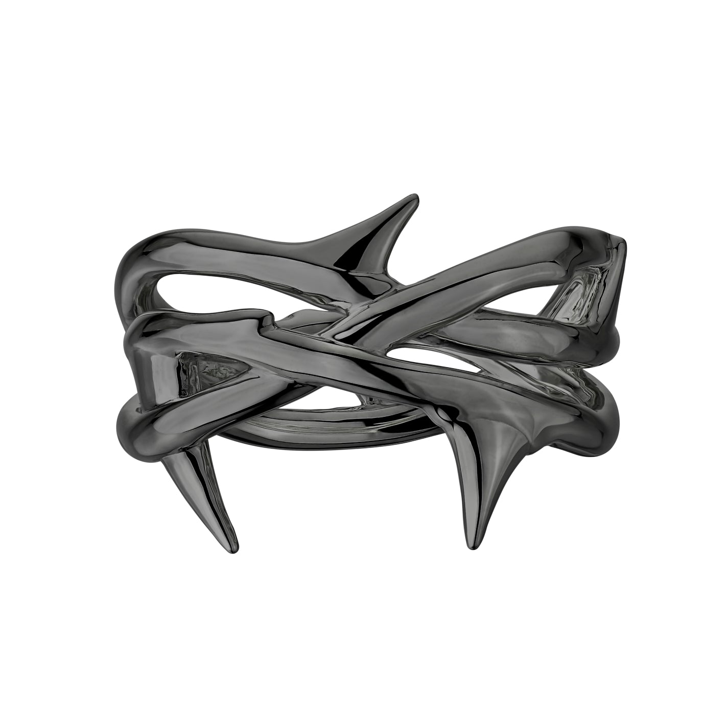 Rose Thorn Triple Band Ring is handcrafted from silver black rhodium. Resplendent, thorn-strewn vines of silver black rhodium form knotted twists like living organisms, creating an ornate triple band that curls around the finger in a multi-stranded silhouette. Evoking an organic garden in winter, Rose Thorn rings are miniature landscapes with texture and tactility, thorny spikes and riveted, burly ridges that are beautiful to touch. Rose Thorn sits at the heart of our House code, Flora; a celebration of botanical beauty that is the symbiosis of Leane's emotive handwriting. Visual, sensitive, harmonious. Available in a variety of precious metal finishes.