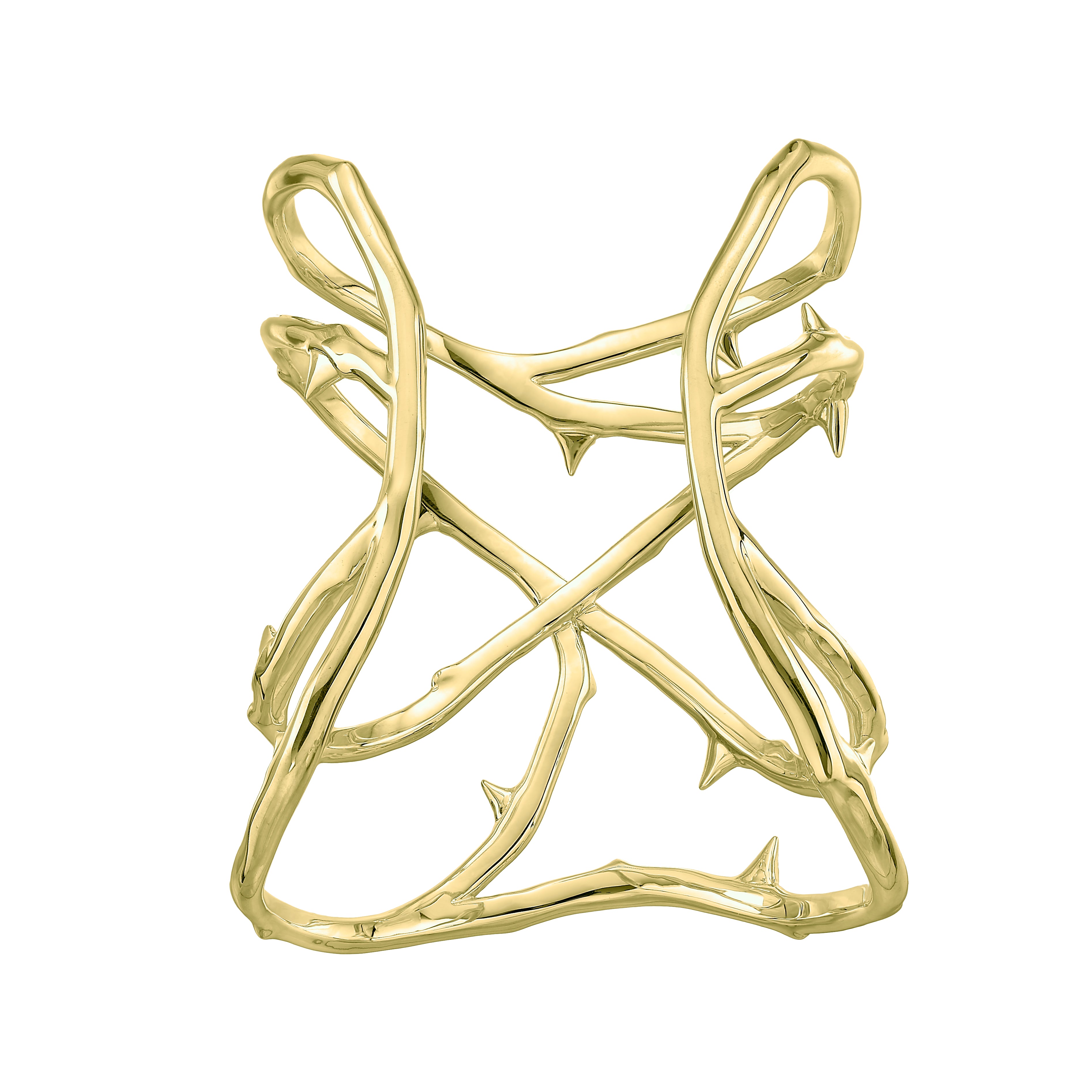 Rose Thorn Cuff is handcrafted from yellow gold vermeil. In Rose Thorn, Shaun Leane's free and melodious style takes on a fuller, richer life. A glistening web of riveted, thorn-strewn burly vines in yellow gold vermeil enclose the wrist, creating a resplendent slip-on cuff, perfectly shaped to your wrist and tapered to your arm. Metallic, illustrious, in sculpted yellow gold vermeil, Rose Thorn's metal vines metamorphose into a modern-day armour, a powerful statement in magical fantasy. Rose Thorn pieces are an explosion of texture and tactility, with thorny spikes and wide-veined, rounded ridges that are beautiful to touch. The weight of the jewels and the variety of scale replicate shapes found in nature. Rose Thorn sits at the heart of our House code, Flora; a celebration of botanical beauty that is the symbiosis of Leane's emotive handwriting. Otherworldly protection through elegance. Available in a variety of precious metal finishes.