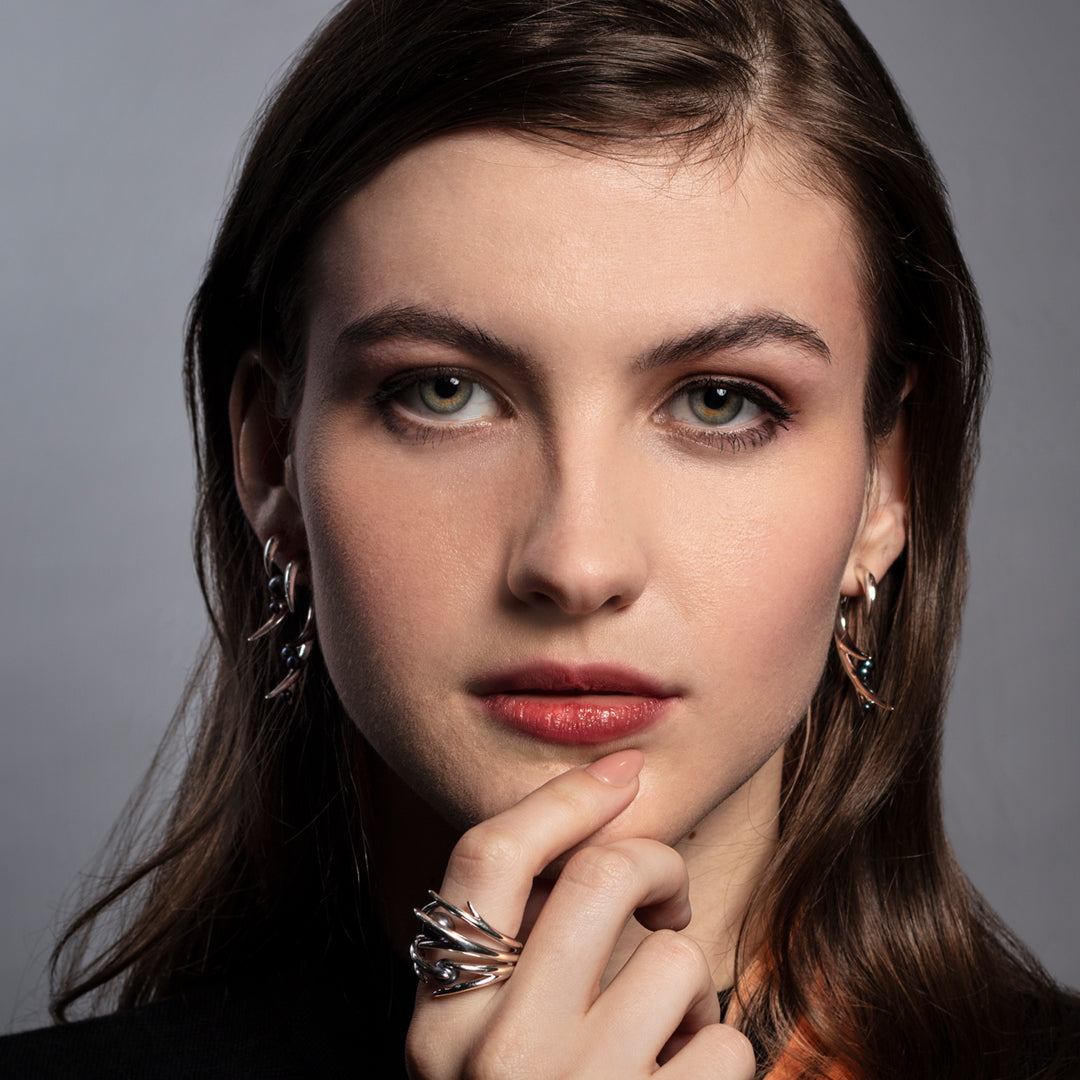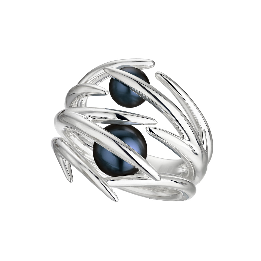 Handcrafted from sterling silver, a large black freshwater pearl and a small black freshwater pearl, our Hooked Pearl Ring is our unique and contemporary take on the classic pearl cocktail ring. Architectural, arched spikes of glistening silver cocoon the finger in a bejewelled domed-cage, nesting a pair of black freshwater pearls within. Our House code, Line, is in its dynamic design, drawing forth Leane's own fascination of barbed and blossoming forms. The Hooked Pearl silhouette - curled, curvilinear, generous - creates a voluminous envelopment of sharp lines and perfect pearls. Ravish.