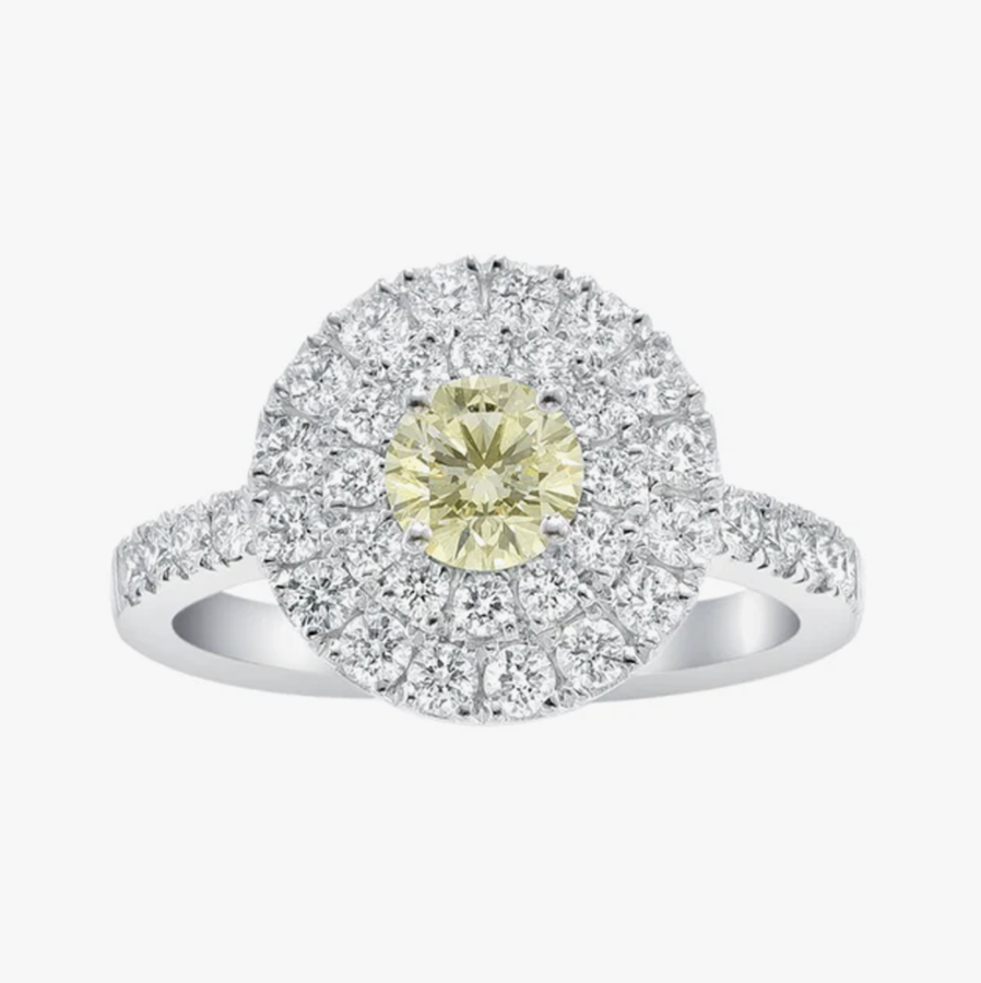Platinum band and setting featuring a central 0.51ct brilliant-cut yellow diamond and white diamond pave.