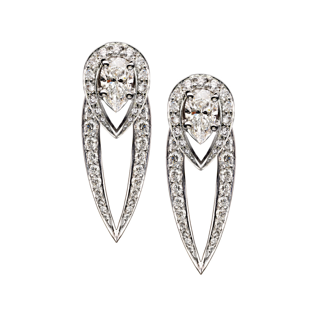 Interlocking Ariana Earrings are handcrafted from 18ct white gold and 1.96cts of brilliant white diamonds. These extraordinary statement diamond earrings feature our double-swept silhouette; festooned curves shimmer on a knife edge, spotlit with dozens of precision-set pavé diamonds. Encased in their centre, two magnificent pear-shaped brilliant white diamonds weighing a sizeable 1ct. Our Ariana earrings are inspired by wild fauna found in nature, an intrinsic code of the House of Shaun Leane. Easy to wear, our diamond earrings are fastened at the back by a butterfly, transitioning effortlessly from day to evening. These are milestone pieces - collectible, timeless, iconic. Earrings you will never want to take off, and will treasure forever.