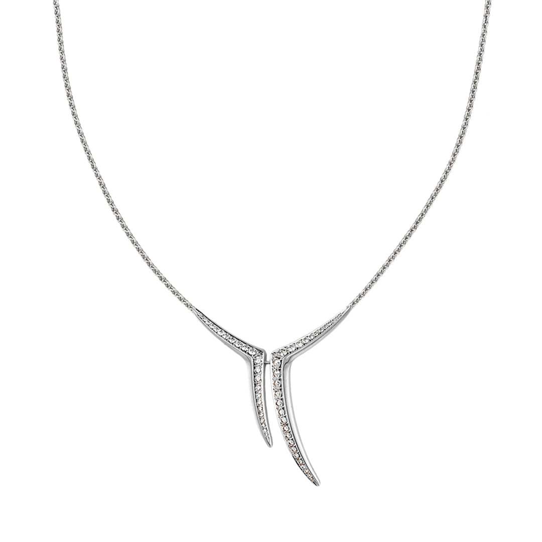 Sabre Fine Aerial Small Necklace is handcrafted from platinum and 0.88cts of brilliant white diamonds. Its double-forked silhouette is cut on a knife edge, drawing light towards the collarbone for maximum impact. A dazzling diamond pavé facade is hand-finished, the meticulous execution you have come to expect from the House of Shaun Leane. Held in a balance by the most delicate of chains, made in-house at our London atelier. Exquisite materials and timeless design evoke a sense of romance when wearing.