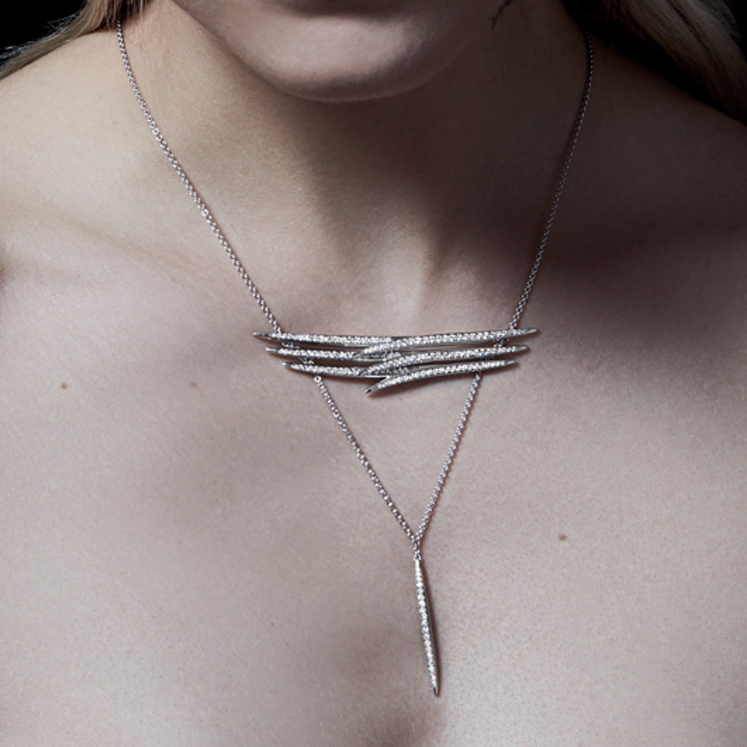 Armis Triple Row Necklace is crafted from 18ct white gold and 1.86cts of brilliant white diamonds, an exquisite piece by the House of Shaun Leane. A nexus of white gold and diamond light, we take our iconic Armis silhouette and spin architectural symmetry on its head. Interlocking lines of precision-set pavé diamonds, frames the décolletage in a sequence of light and movement. Held afloat by the most delicate of chains, made at our London atelier. This is a milestone piece you will treasure forever.