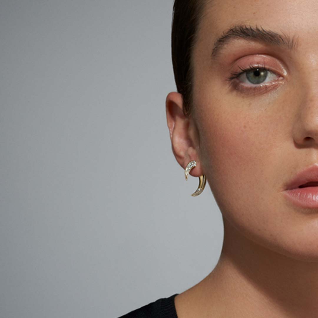 Talon Fine Large Earrings are handcrafted from 18ct yellow gold and 0.90cts of brilliant white diamonds. The Talon Fine collection takes a renowned silhouette of perfect knife-edged curves and fuses unbound imagination. A contemporary take on hoop earrings, the inclusion of diamonds - from tip to tail - offers a more precious alternative, with pieces to suit all tastes. Precision-set pave diamonds draw light towards the face, providing a further layer of sophistication, taking you through to evening. With an exquisite drop of 20mm in length, and a meticulous 360 degree finish, always. Expect perfection.