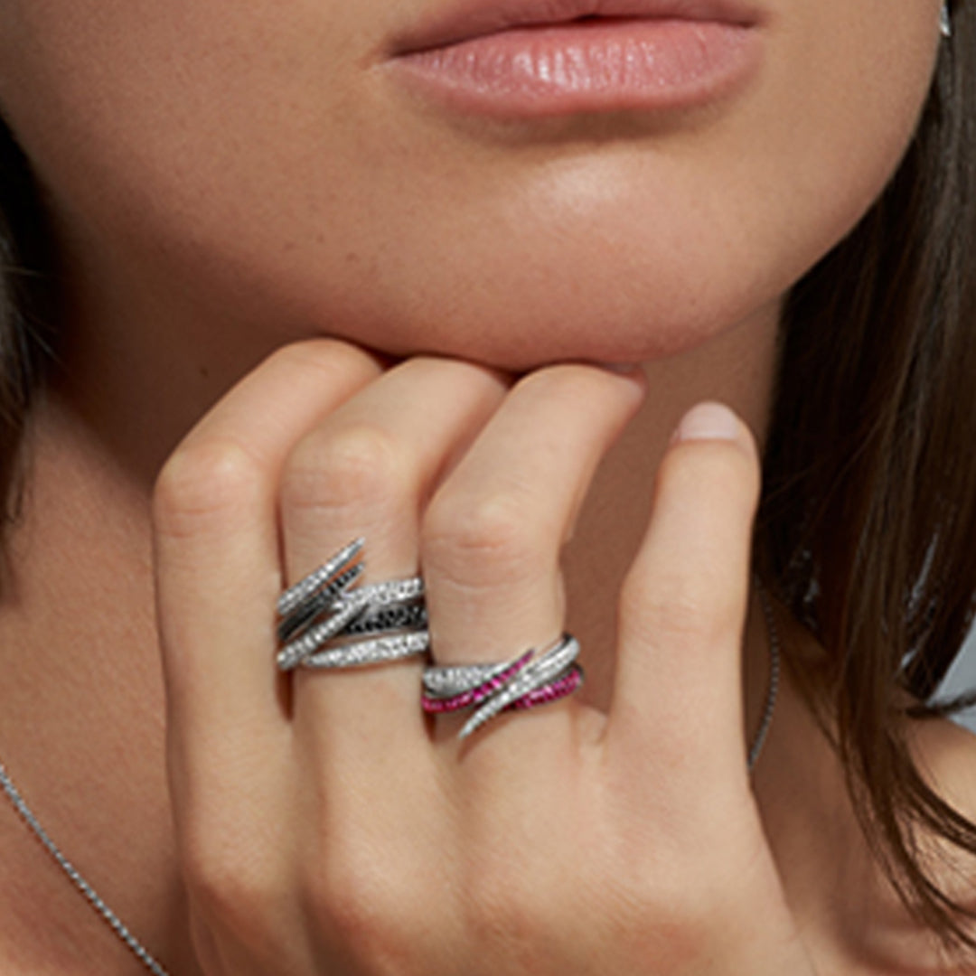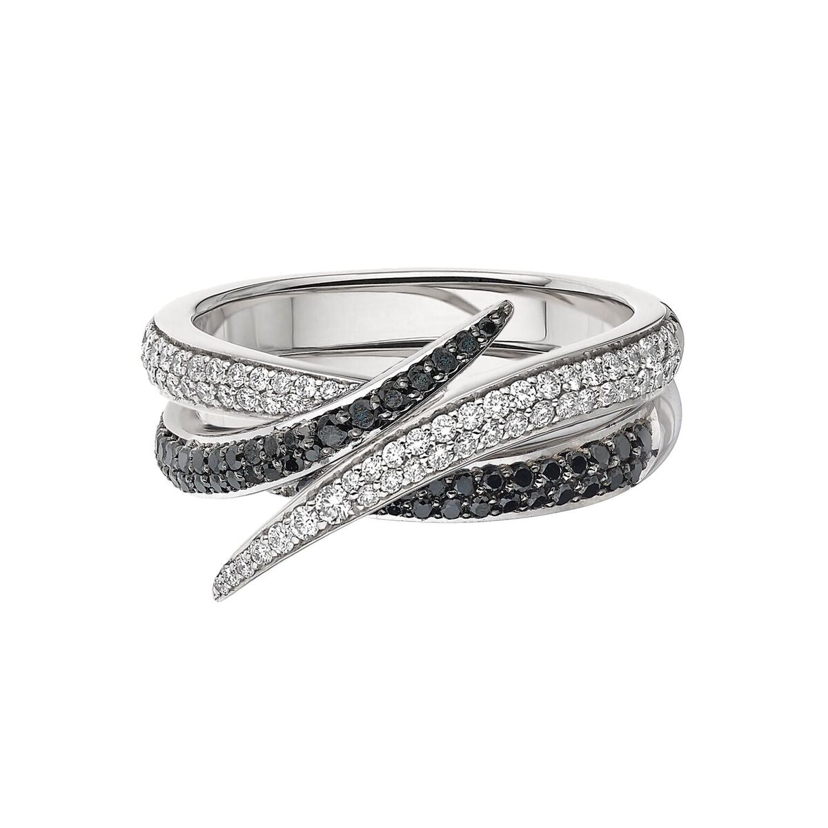 Interlocking Single Ring is handcrafted from 18ct white gold and 0.55cts of black diamonds, a classic piece by the House of Shaun Leane. We diffuse our iconic silhouette, with its accented sweeping point, into versatile, collectible jewels, designed to be built over time. Stack, assemble, mix with other Interlocking rings, to form bejewelled sets you will treasure forever. Available in a playful variety of colourful gemstones, the wearing possibilities are endless.