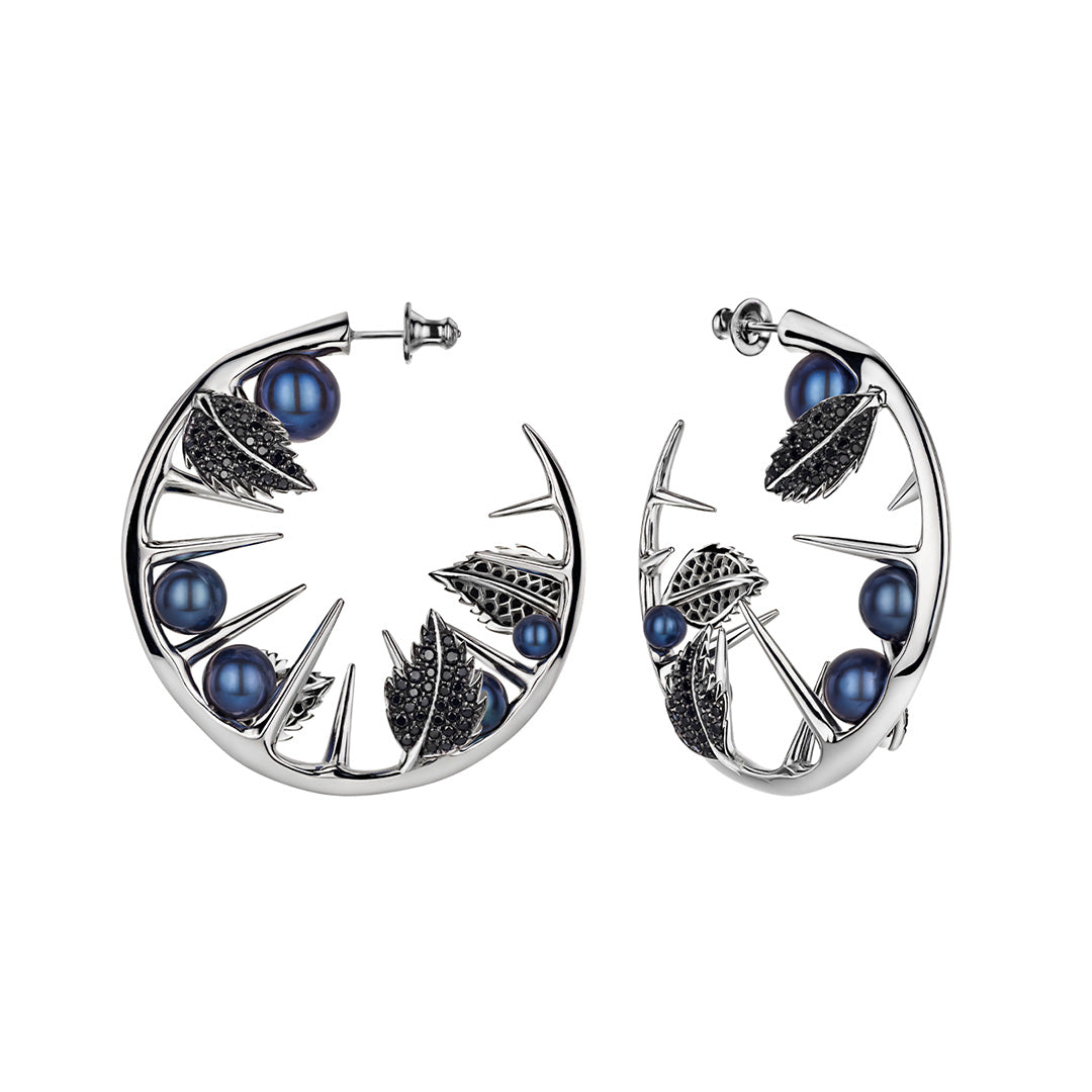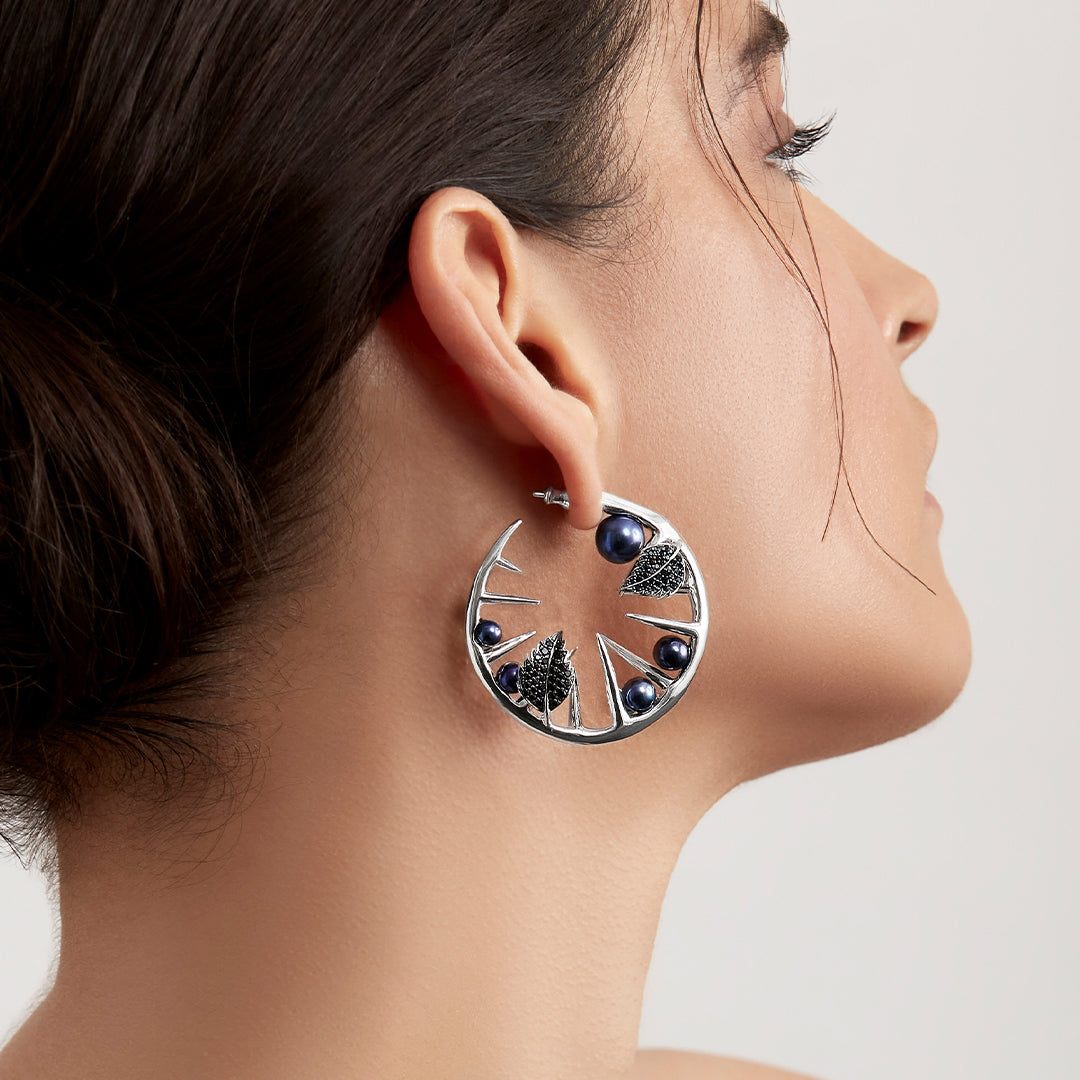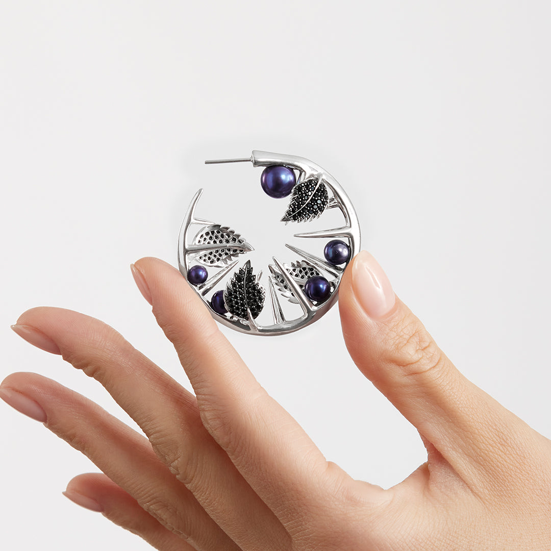 Blackthorn Leaf Hoop Earrings - Silver, Black Spinel & Black Pearl
