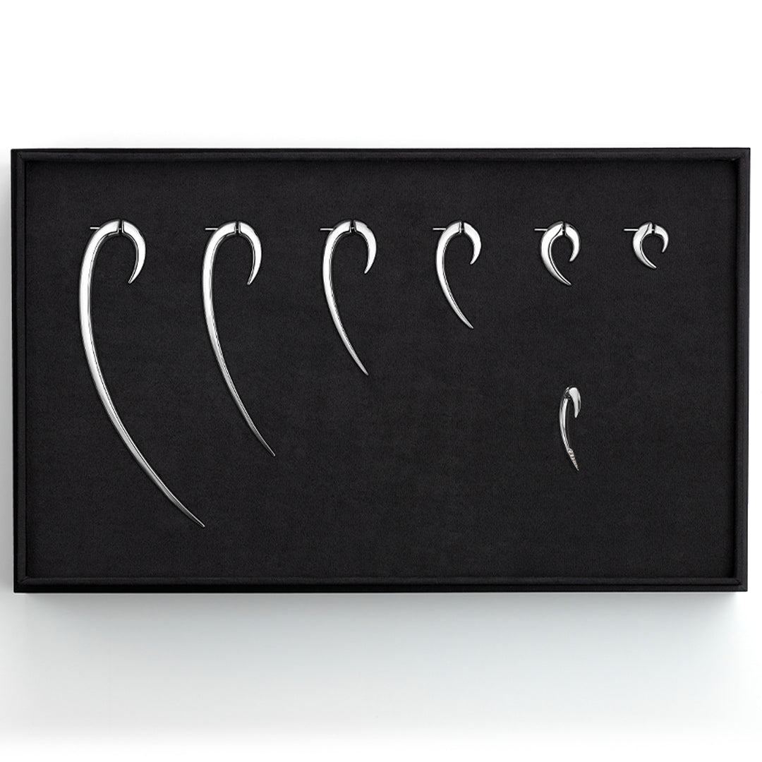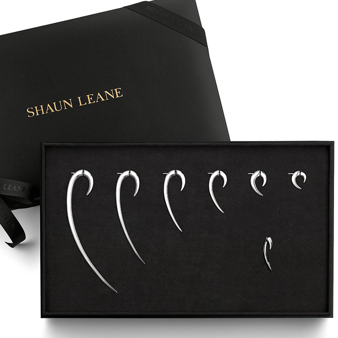 The Iconic Hook Box Set is handcrafted from sterling silver, and includes the Mini Talon, Talon, Hook Size 1, Hook Size 2, Hook Size 3, Hook Size 4 and the showstopping Hook with Diamond Pavé. This unprecedented set of all our signature Hook pieces together celebrates the iconic silhouette - a powerful curvilinear line - that turned Shaun Leane's single earring into a piece of iconography. Hook Earrings are designed to compliment the line of your neck, framing your jawline, using traditional goldsmithing techniques such as the knife-edge, carving light refracting facets on the surface that sharpen the silhouette. Hook's innovative design is a two-piece construction, seamlessly fitting together front to back, creating a graduated shape around the ear, securely fastened in place. Evolving over time in length and proportion, in a variety of finishes, with and without stones, Hook's offer enviable versatility and styling options. True modern collectibles - all in one signature black box.