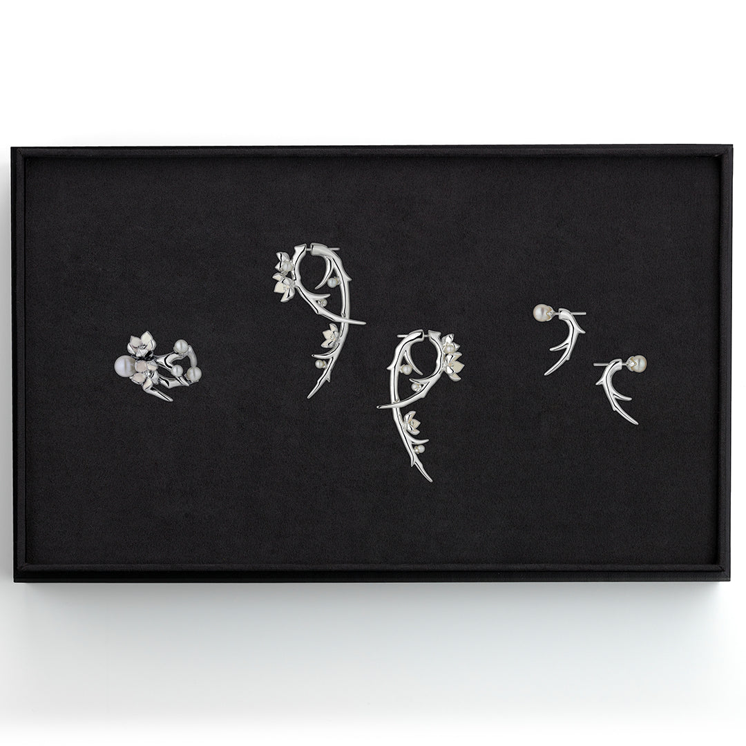 The Cherry Blossom Box set celebrates this fleeting beauty of nature and offers great versatility for the collector. Containing the Cherry Blossom branch earrings which can be worn two ways owing to their clever construction, as a drop or simply as a pearl ear stud; the Cherry Blossom full flower ring which is no less than a delightfully bejewelled posy on your finger; and the showstopping, dramatically abundant, Cherry Blossom large hook earrings. Everything you need in a box set.