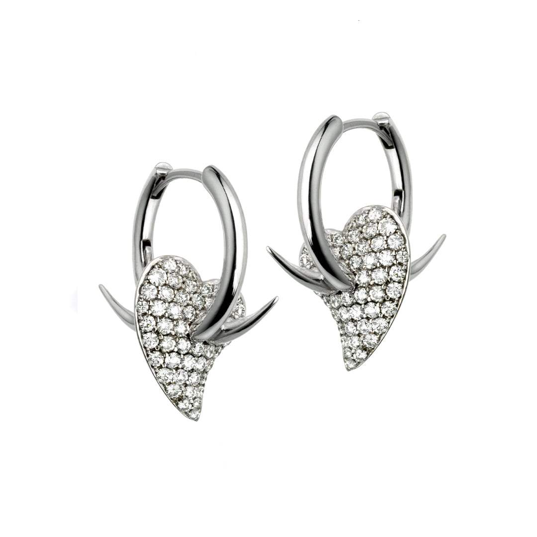 Impassioned is an Art Nouveau inspired capsule collection, celebrating a deep devoted love. A daring pierced heart, scintillating in diamond pave, drops elegantly from a precious metal mini hoop. Hugging the earlobe, it's defiant & bold, double-pointed. These earrings express the importance to be in love, and to be loved. Wholeheartedly. They are an Impassioned declaration of love.