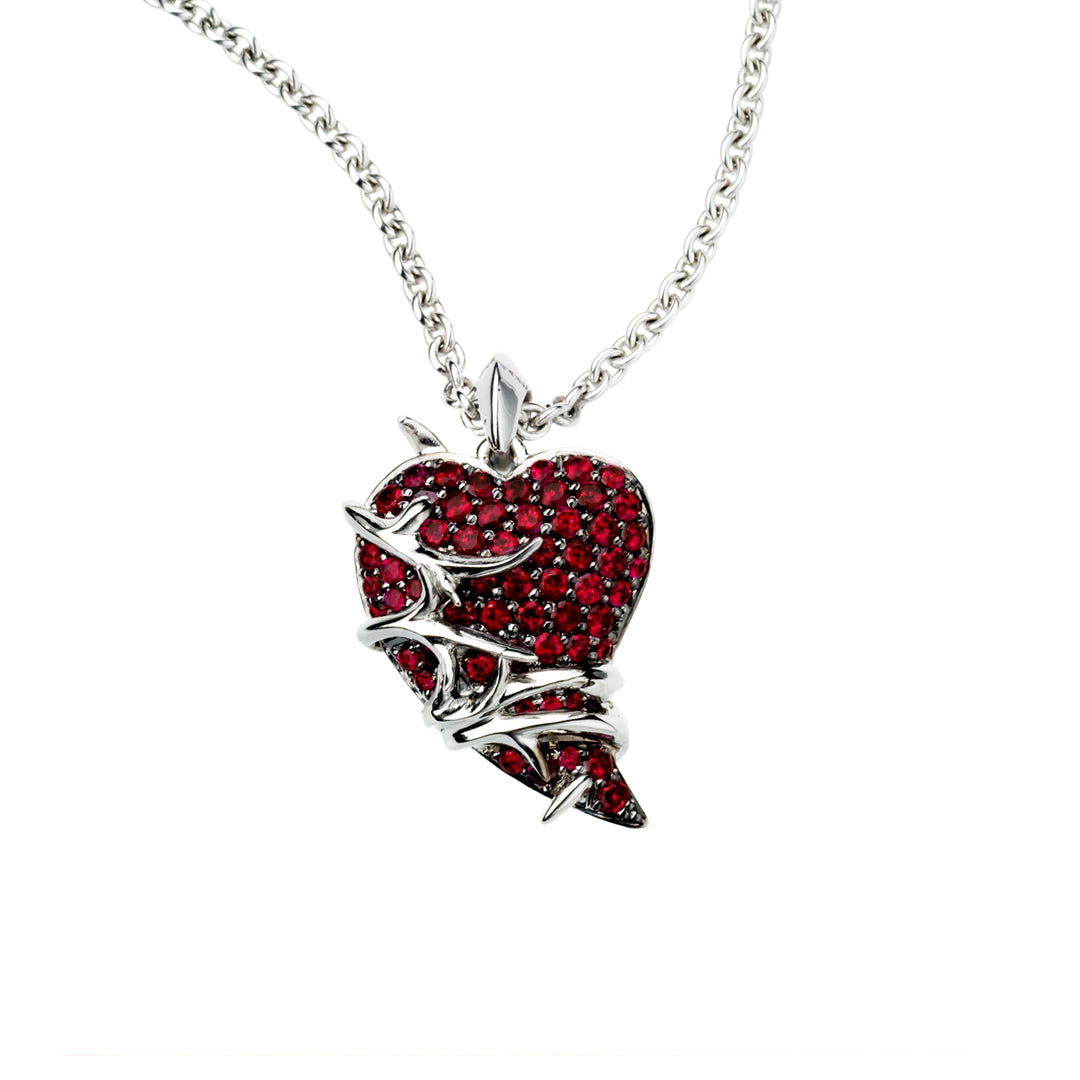 Impassioned is an Art Nouveau inspired capsule collection, celebrating a deep devoted love. A daring heart, enraptured in precious thorn-laden vines, undulates & scintillates in ruby pave, elegantly poised on a pendant chain. This necklace expresses the importance to be in love, and to be loved. Wholeheartedly. It's an Impassioned declaration of love.