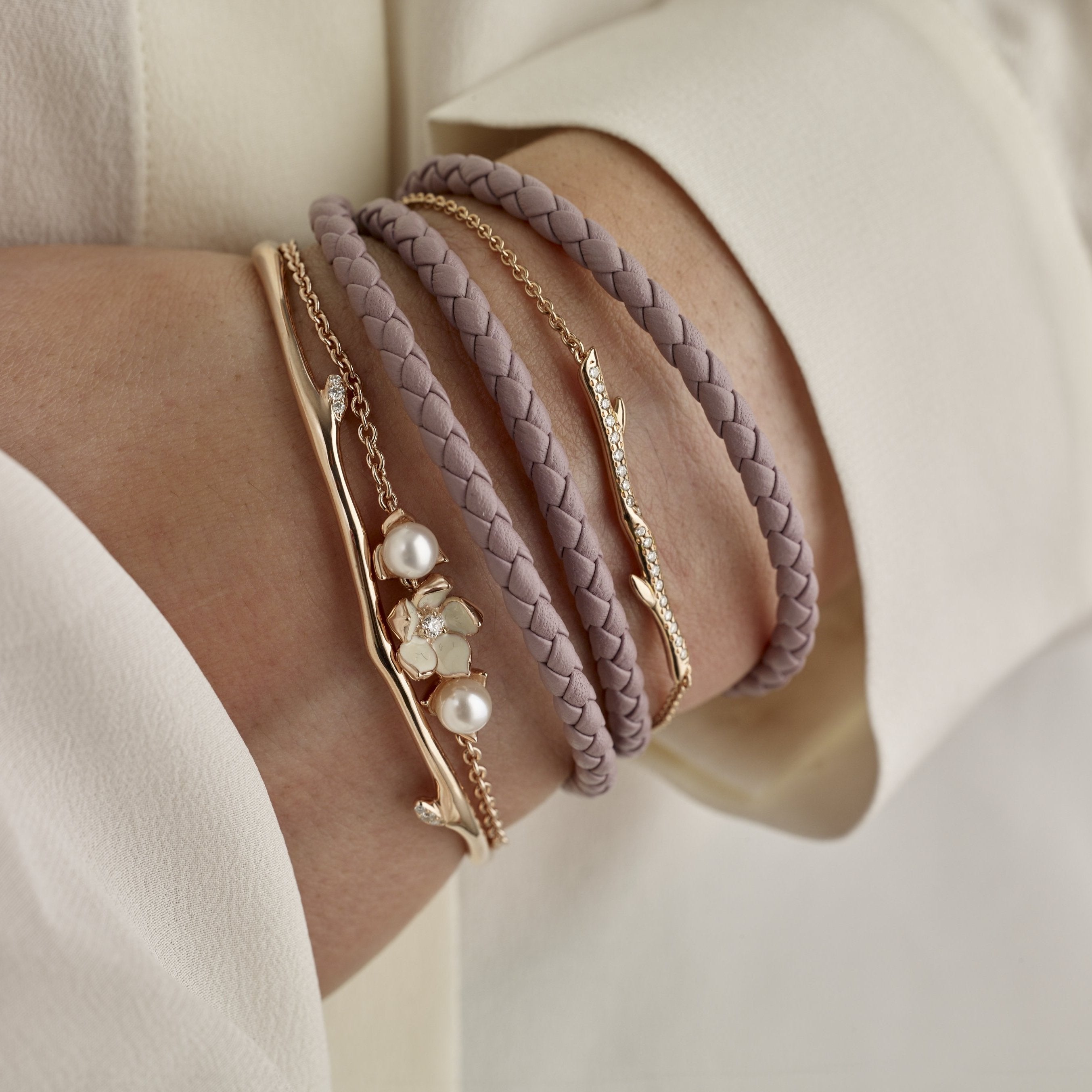 Cherry Blossom Bangle is handcrafted from rose gold vermeil and 0.05cts of brilliant white diamonds. Cherry Blossom is an evolution of our House code towards the natural world, inspired by the renewal and optimism of the Japanese Cherry Blossom tree. Strength and fragility are rooted in its branches, casting beautiful shapes across urban landscapes. Rose gold blossom branches curve a silhouette around the wrist, drawing the light: enamel blooms with brilliant-cut diamond stamens. Materials exquisite yet delicate enough for everyday wear. Our bangles have heft, stature, durability - contoured to move with your body.