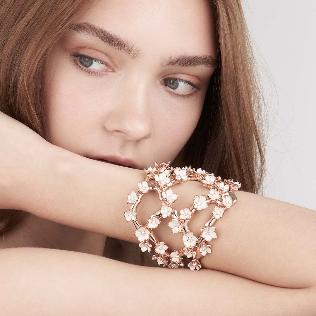 Cherry Blossom (Multi) Flower Cuff is a couture piece from the Cherry Blossom collection. Inspired by Japanese wild flora and the natural world, Cherry Blossom features timeless pieces of exceptional quality and originality. Handcrafted from rose gold vermeil and 2.51cts of brilliant-cut diamonds, a silken web of rose gold branches enclose the wrist in a glistening silhouette. Dozens of articulated blooms, in pearlescent enamel with hand-cut petals and brilliant white diamond stamens, complete the romance. With a diameter of 5.9cm, our cuff has stature on the wrist, and we recommend wearing as a pair. Designed to slip on with ease, it feels solid when worn.