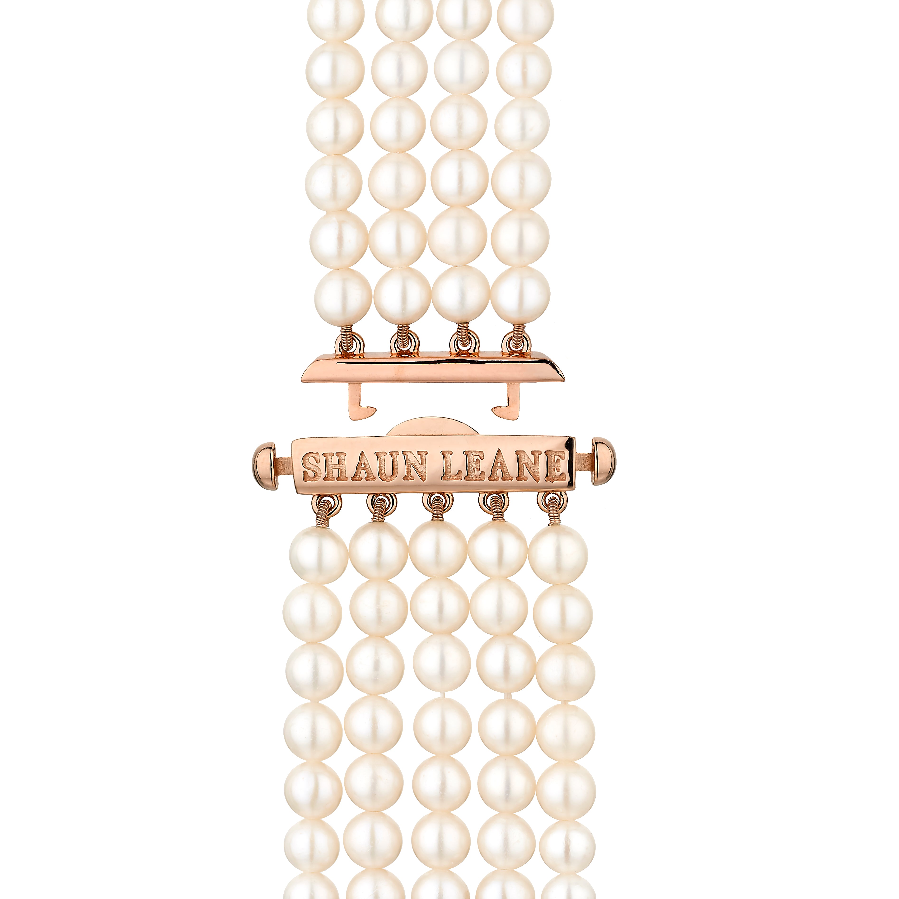 Cherry Blossom Strand Bracelet is handcrafted from rose gold vermeil, 0.60cts of brilliant white diamonds and dozens of large freshwater pearls. The Cherry Blossom collection is a shift towards figurative design, with the House of Shaun Leane edge. Interwoven Blossom branches take centre stage and wrap the wrist, replete with dazzling pearlescent enamel blooms, brilliant-cut diamond stamens and rose gold accents. Enclosing the silhouette: five magnificent rows of freshwater pearls, creating shape and movement. Cut to contour your body and designed with a spring hinge, our pearl bracelet fastens with a push-button clasp.