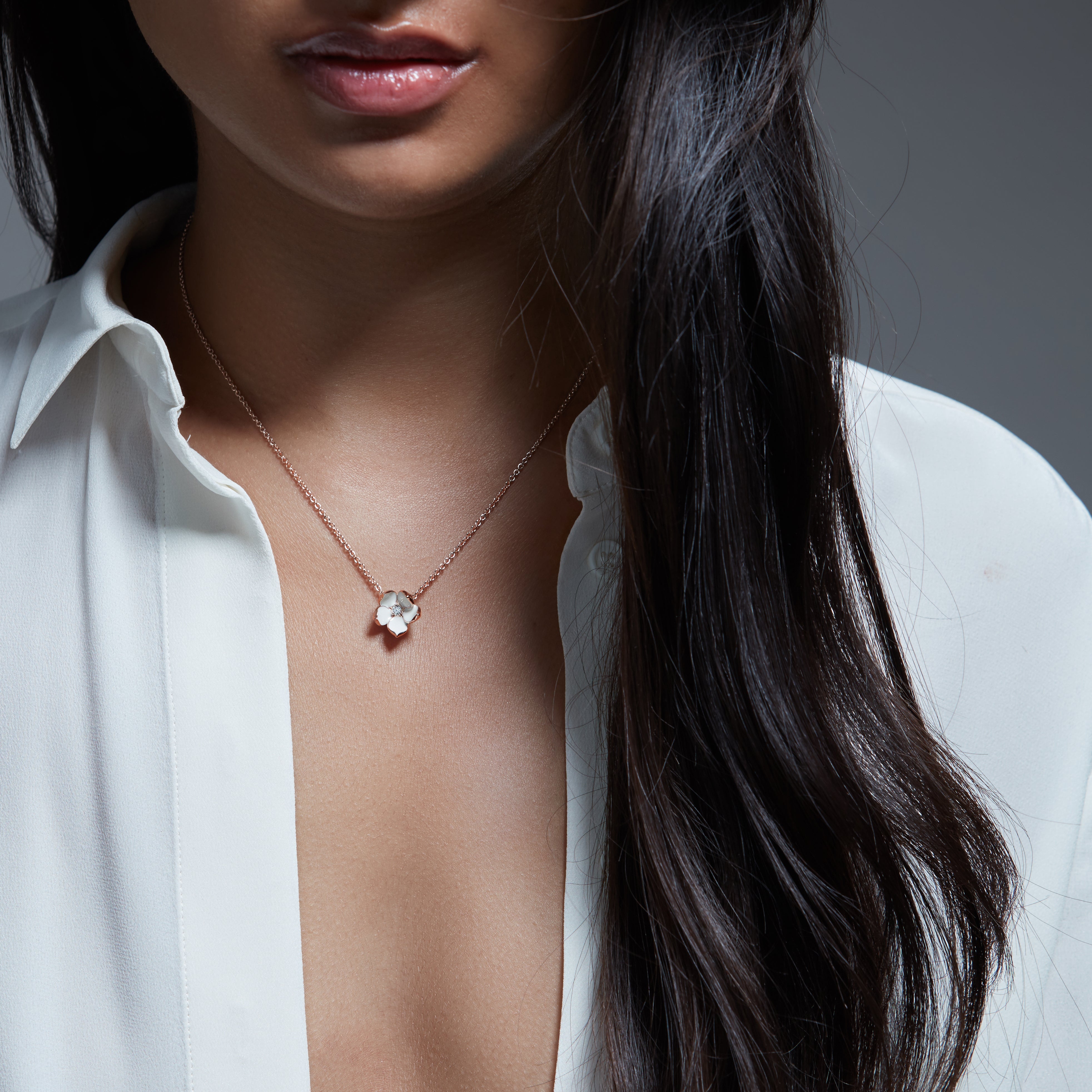 Cherry Blossom Large Flower Pendant is handcrafted from rose gold vermeil and a 0.07ct brilliant white diamond at its centre. Cherry Blossom is a shift in silhouette towards more organic shapes, an evolution of our House code, wild flora. The optimism of Japanese blossoms in springtime is evoked in pearlescent enamel, in opulent ivory; in full bloom, with brilliant-cut diamond stamens and rose gold accents. The complexity of materials is delicate enough to wear everyday, with the originality and exceptional quality you have come to expect from the House of Shaun Leane.