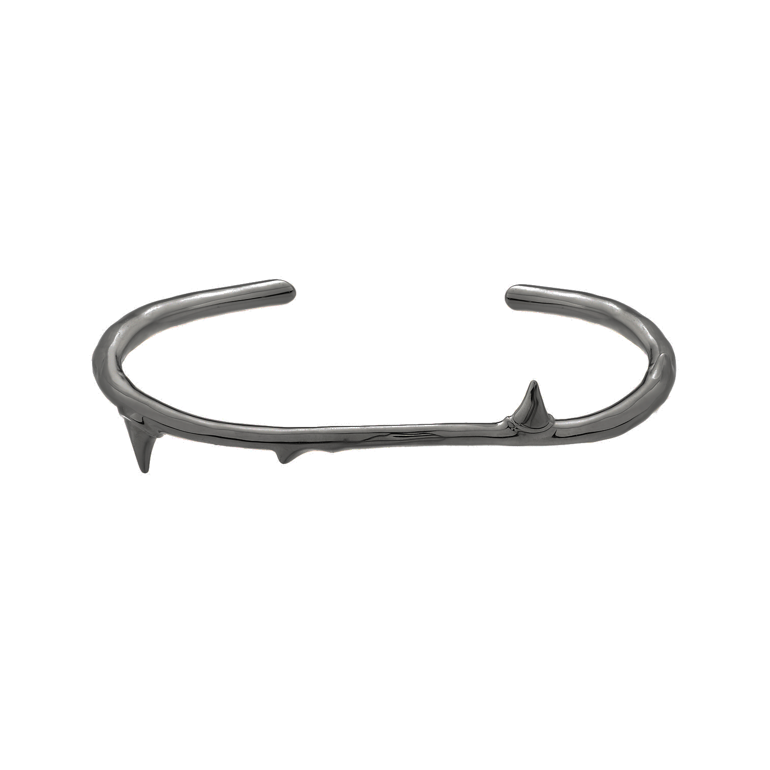 Rose Thorn Bangle is handcrafted from silver black rhodium. In Rose Thorn, Shaun Leane's free and melodious style takes on a fuller, richer life. Circling the wrist with some heft, a riveted, thorn-strewn burly vine in silver black rhodium metamorphoses into a glistening slip-on bangle, an organic silhouette that encloses like ivy in a snowy, metallic frost. Rose Thorn bracelets simulate a paradise garden, an explosion of texture and tactility, with thorny spikes and wide-veined, burly ridges that are beautiful to touch. The weight of the pieces and the variety of scale replicate shapes found in nature. Rose Thorn sits at the heart of our House code, Flora; a celebration of botanical beauty that is the symbiosis of Leane's emotive handwriting. Otherworldly protection through elegance. Available in a variety of precious metal finishes.