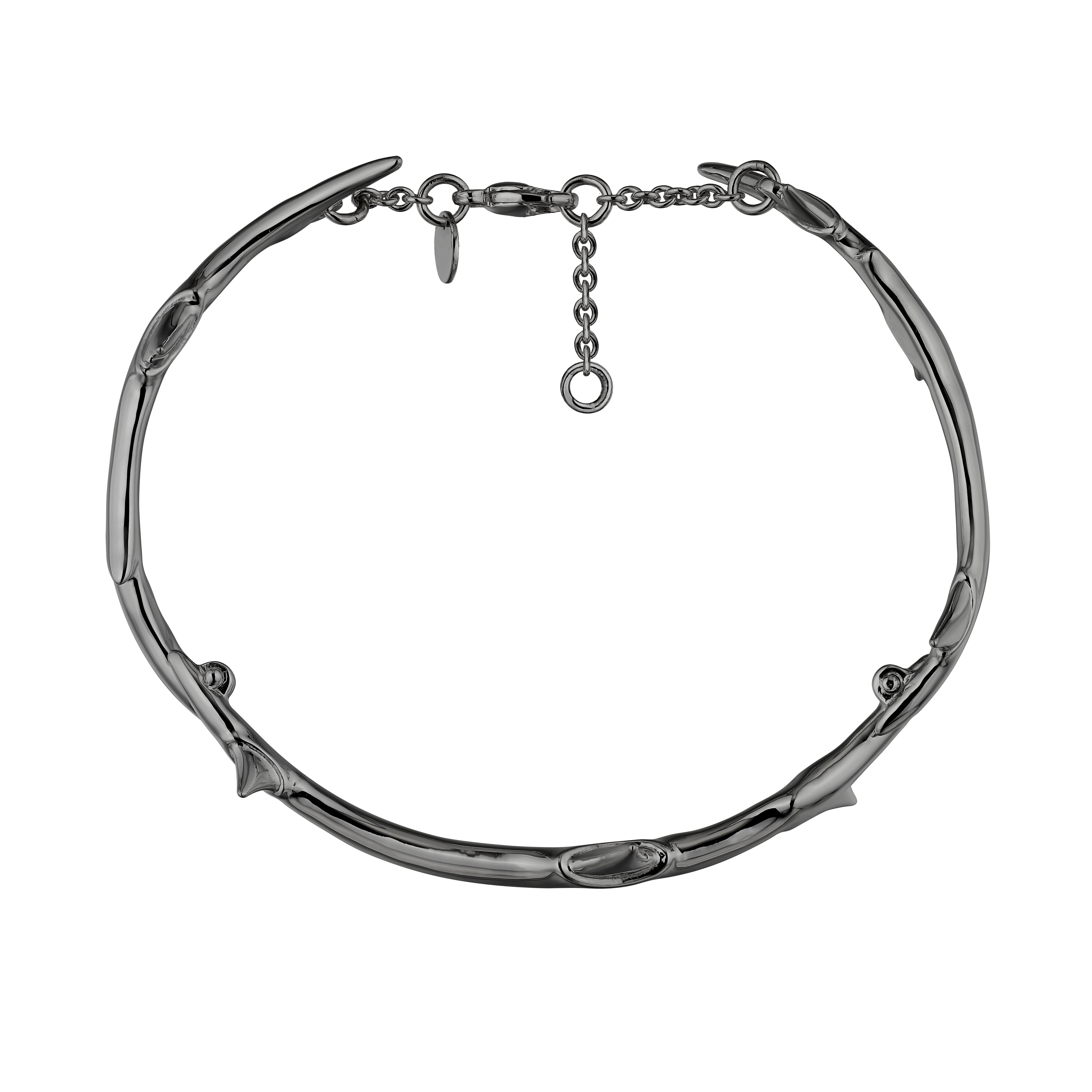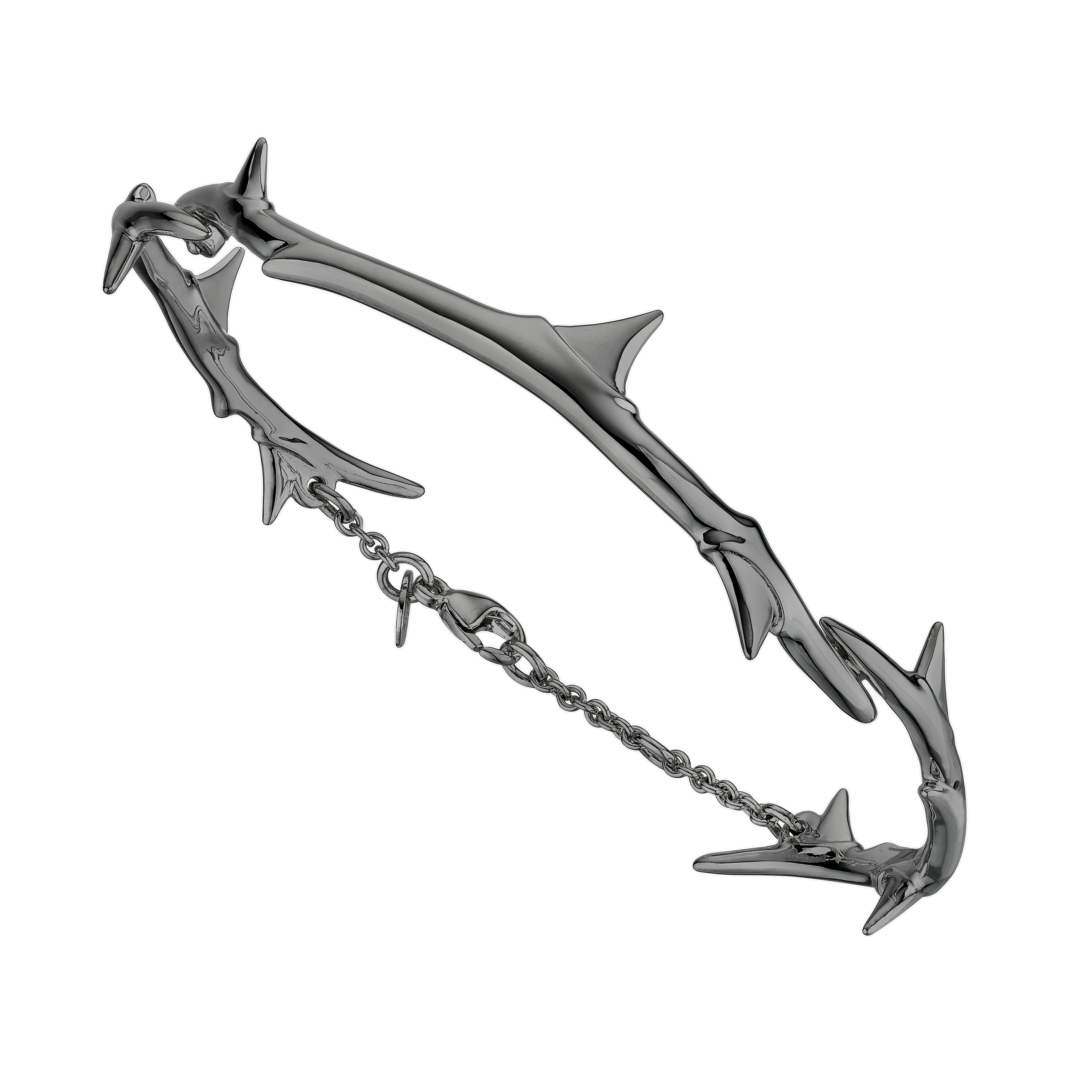 Rose Thorn Station Bracelet is handcrafted from silver black rhodium. In Rose Thorn, Shaun Leane's free and melodious style takes on a fuller, richer life. Enclosing the wrist, a resplendent, thorn-strewn riveted vine of silver black rhodium - attached from the back by a subtle silver black rhodium chain, adjustable to three different lengths. Rose Thorn bracelets simulate a paradise garden, an explosion of texture and tactility, with thorny spikes and wide-veined, burly ridges that are beautiful to touch. Replicating organic shapes found in nature, there is weight to the pieces and variety of scale, wrapping the wrist like ivy in a metallic frost. Rose Thorn sits at the heart of our House code, Flora; a celebration of botanical beauty that is the symbiosis of Leane's emotive handwriting. Otherworldly protection through elegance. Available in a variety of precious metal finishes.