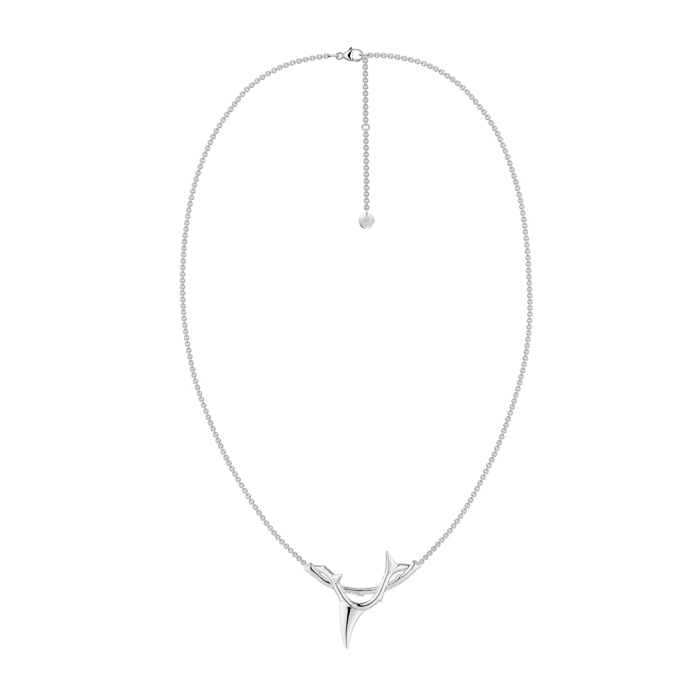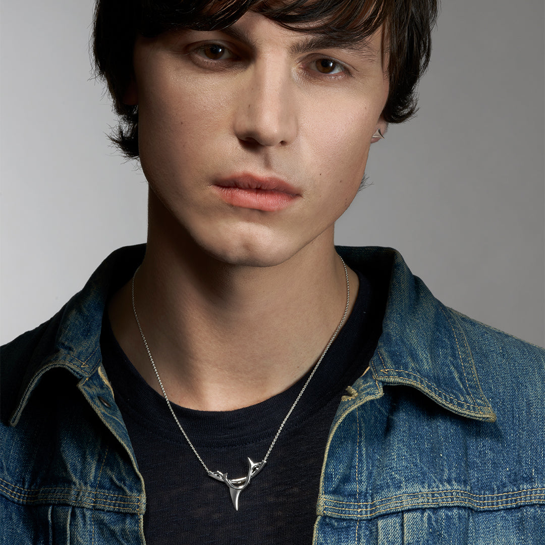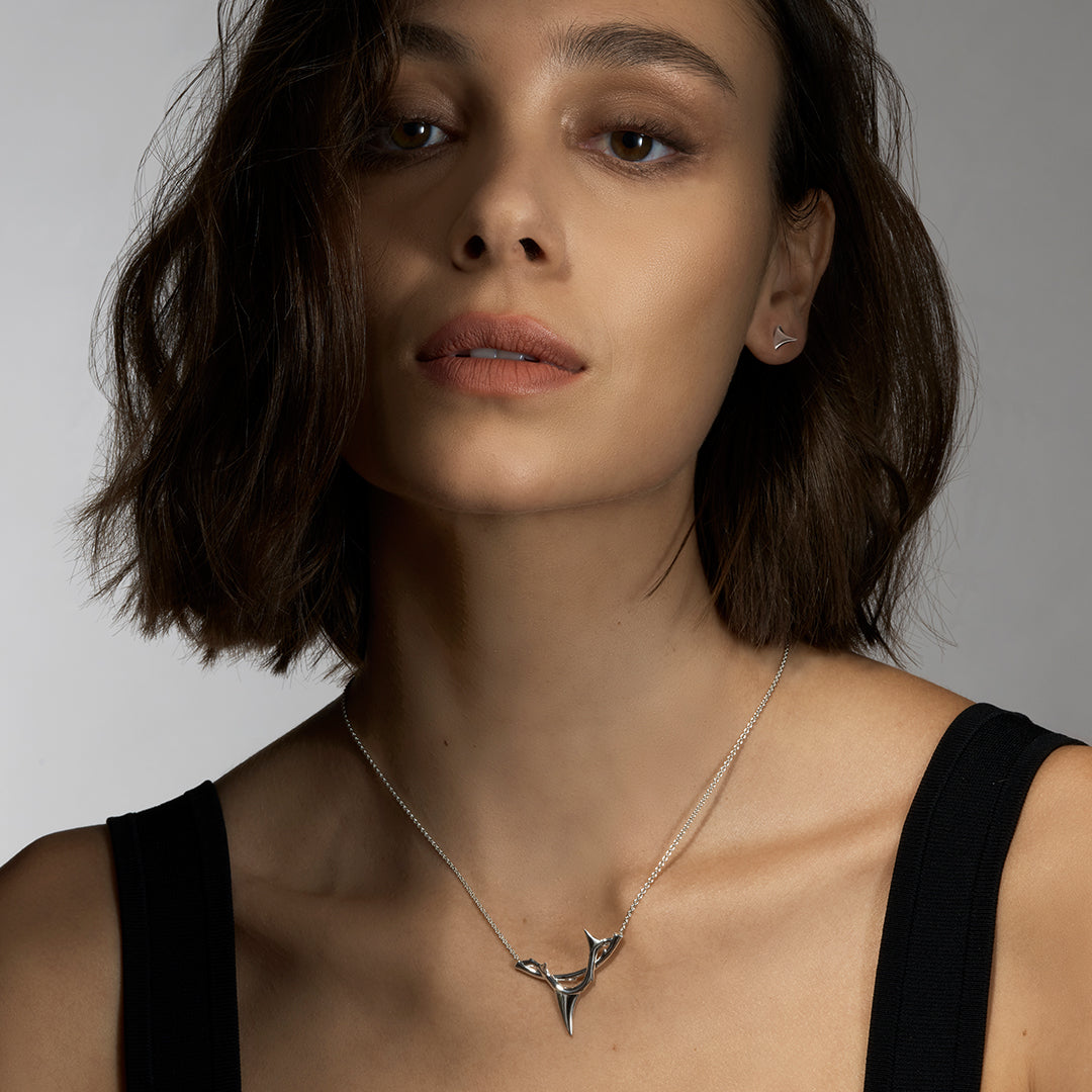 Rose Thorn Branch Pendant is handcrafted from sterling silver. In Rose Thorn, Shaun Leane's alive and figurative style takes on a fuller, richer life. A beautiful entanglement of riveted, thorn-strewn vines in sterling silver curve a small arc across the collarbone, with glistening twists and a single, large burly thorn protruding downwards, evoking a sensual movement - suspended above the colletage from a subtle sterling silver chain, adjustable to three lengths. Worn high, capturing the light and drawing attention to the piece. Rose Thorn necklaces are miniature landscapes cast in precious metals, intricate pieces suspended in mid-air with a sense of weightlessness and movement, yet made with real substantiality. Rose Thorn sits at the heart of our House code, Flora; a celebration of botanical beauty that is the symbiosis of Leane's emotive handwriting - a free, melodious, harmonious choreography. Otherworldly protection through elegance. Available in a variety of luxurious finishes.