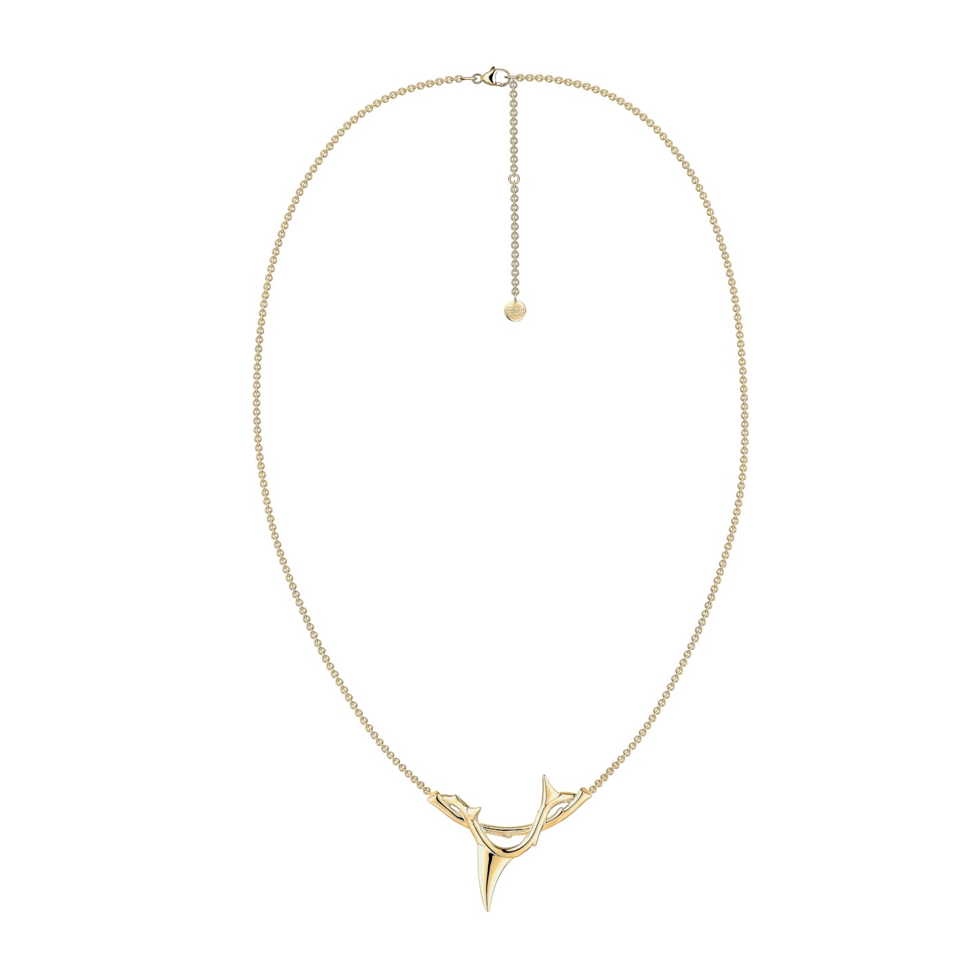 Rose Thorn Branch Pendant is handcrafted from yellow gold vermeil. In Rose Thorn, Shaun Leane's alive and figurative style takes on a fuller, richer life. A beautiful entanglement of riveted, thorn-strewn vines in yellow gold vermeil curve a small arc across the collarbone, with glistening twists and a single, large burly thorn protruding yellow gold vermeil sterling silver chain, adjustable to three lengths. Worn high, capturing the light and drawing attention to the piece. Rose Thorn necklaces are miniature landscapes cast in precious metals, intricate pieces suspended in mid-air with a sense of weightlessness and movement, yet made with real substantiality. Rose Thorn sits at the heart of our House code, Flora; a celebration of botanical beauty that is the symbiosis of Leane's emotive handwriting - a free, melodious, harmonious choreography. Otherworldly protection through elegance. Available in a variety of luxurious finishes.