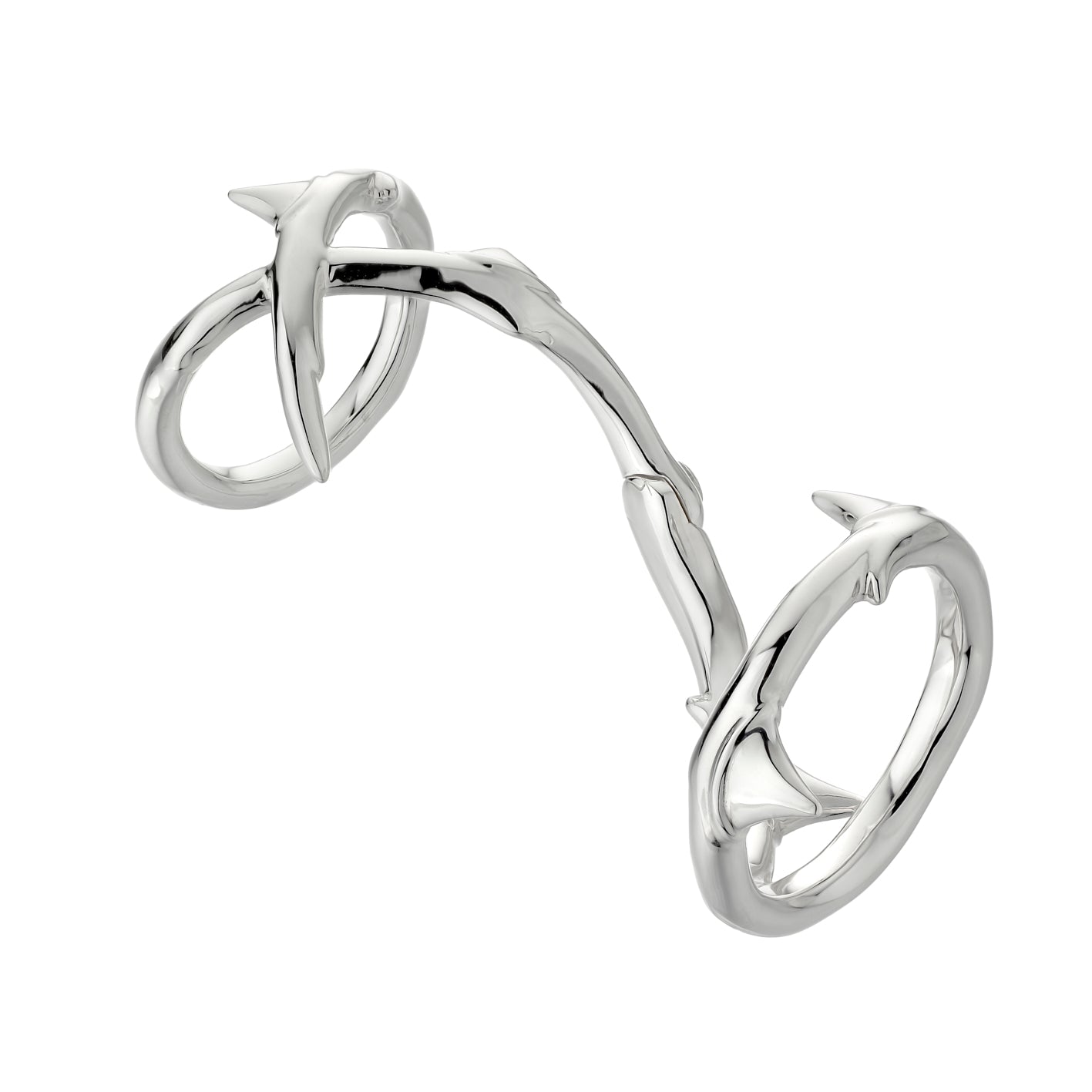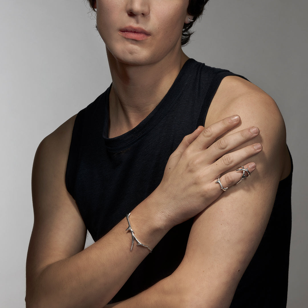 Rose Thorn Hinged Ring is handcrafted from sterling silver. An expression of exemplary craftsmanship, sitting on the finger with ease, two separate halo rings of thorny, veined stems connect through a resplendent twisted vine of sterling silver, adorning the finger as one Long Ring'. A hidden hinge allows for supple flexibility and movement, sitting comfortably, at once low and high, dressing the entire length of the finger. Evoking an organic garden in winter, Rose Thorn rings are miniature landscapes with texture and tactility, thorny spikes and riveted, burly ridges that are beautiful to touch. Rose Thorn sits at the heart of our House code, Flora; a celebration of botanical beauty that is the symbiosis of Leane's emotive handwriting. Experience a sensation of emotions. Available in a variety of precious metal finishes.