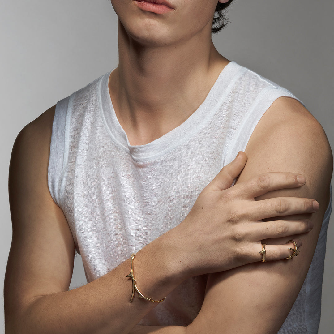 Rose Thorn Hinged Ring is handcrafted from yellow gold vermeil. An expression of exemplary craftsmanship, sitting on the finger with ease, two separate halo rings of thorny, veined stems connect through a resplendent twisted vine of yellow gold vermeil, adorning the finger as one Long Ring'. A hidden hinge allows for supple flexibility and movement, sitting comfortably, at once low and high, dressing the entire length of the finger. Evoking an organic garden in winter, Rose Thorn rings are miniature landscapes with texture and tactility, thorny spikes and riveted, burly ridges that are beautiful to touch. Rose Thorn sits at the heart of our House code, Flora; a celebration of botanical beauty that is the symbiosis of Leane's emotive handwriting. Experience a sensation of emotions. Available in a variety of precious metal finishes.