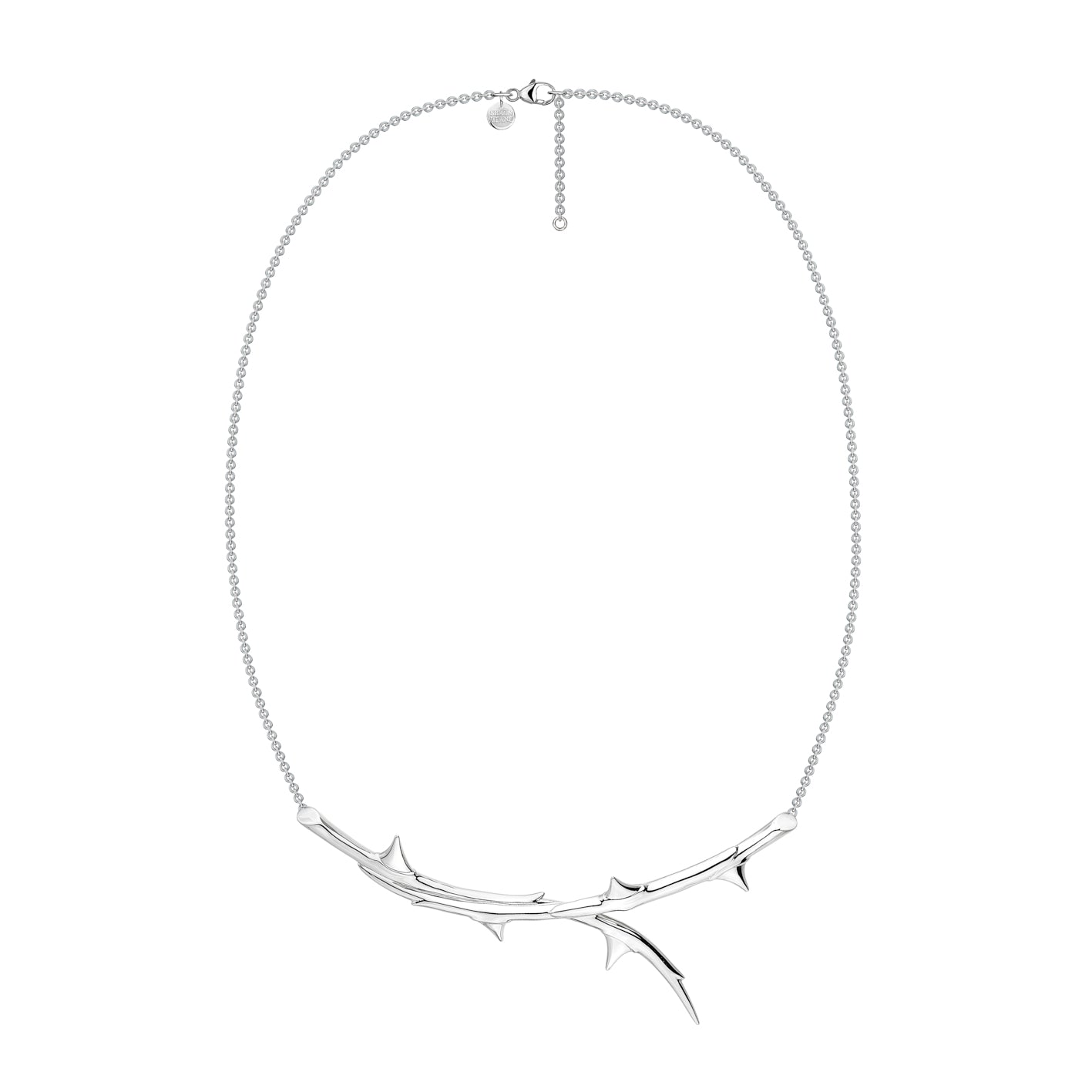 Rose Thorn Horizontal Necklace is handcrafted from sterling silver. In Rose Thorn, Shaun Leane's alive and figurative style takes on a fuller, richer life. Tapered to the curve of your collarbone, a resplendent, thorn-strewn riveted vine of sterling silver curves its arc, with burly thorns and glistening twists protruding outwards - suspended above the colletage from a subtle sterling silver chain, adjustable to two lengths. Worn high capturing the light and drawing attention to the piece. Rose Thorn necklaces are miniature landscapes cast in precious metals, intricate pieces suspended in mid air with a sense of weightlessness and movement, yet made with real substantiality. Rose Thorn sits at the heart of our House code, Flora; a celebration of botanical beauty that is the symbiosis of Leane's emotive handwriting - a free, melodious, harmonious choreography. Otherworldly protection through elegance. Available in a variety of luxurious finishes.