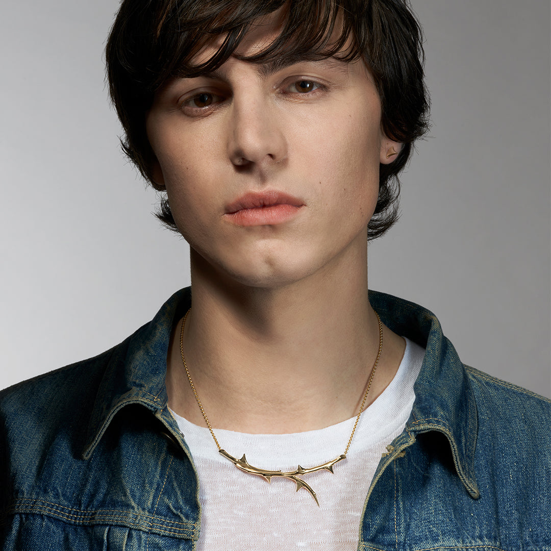Rose Thorn Horizontal Necklace is handcrafted from yellow gold vermeil. In Rose Thorn, Shaun Leane's alive and figurative style takes on a fuller, richer life. Tapered to the curve of your collarbone, a resplendent, thorn-strewn riveted vine of yellow gold vermeil curves its arc, with burly thorns and glistening twists protruding outwards - suspended above the colletage from a subtle yellow gold vermeil chain, adjustable to two lengths. Worn high capturing the light and drawing attention to the piece. Rose Thorn necklaces are miniature landscapes cast in precious metals, intricate pieces suspended in mid air with a sense of weightlessness and movement, yet made with real substantiality. Rose Thorn sits at the heart of our House code, Flora; a celebration of botanical beauty that is the symbiosis of Leane's emotive handwriting - a free, melodious, harmonious choreography. Otherworldly protection through elegance. Available in a variety of luxurious finishes.