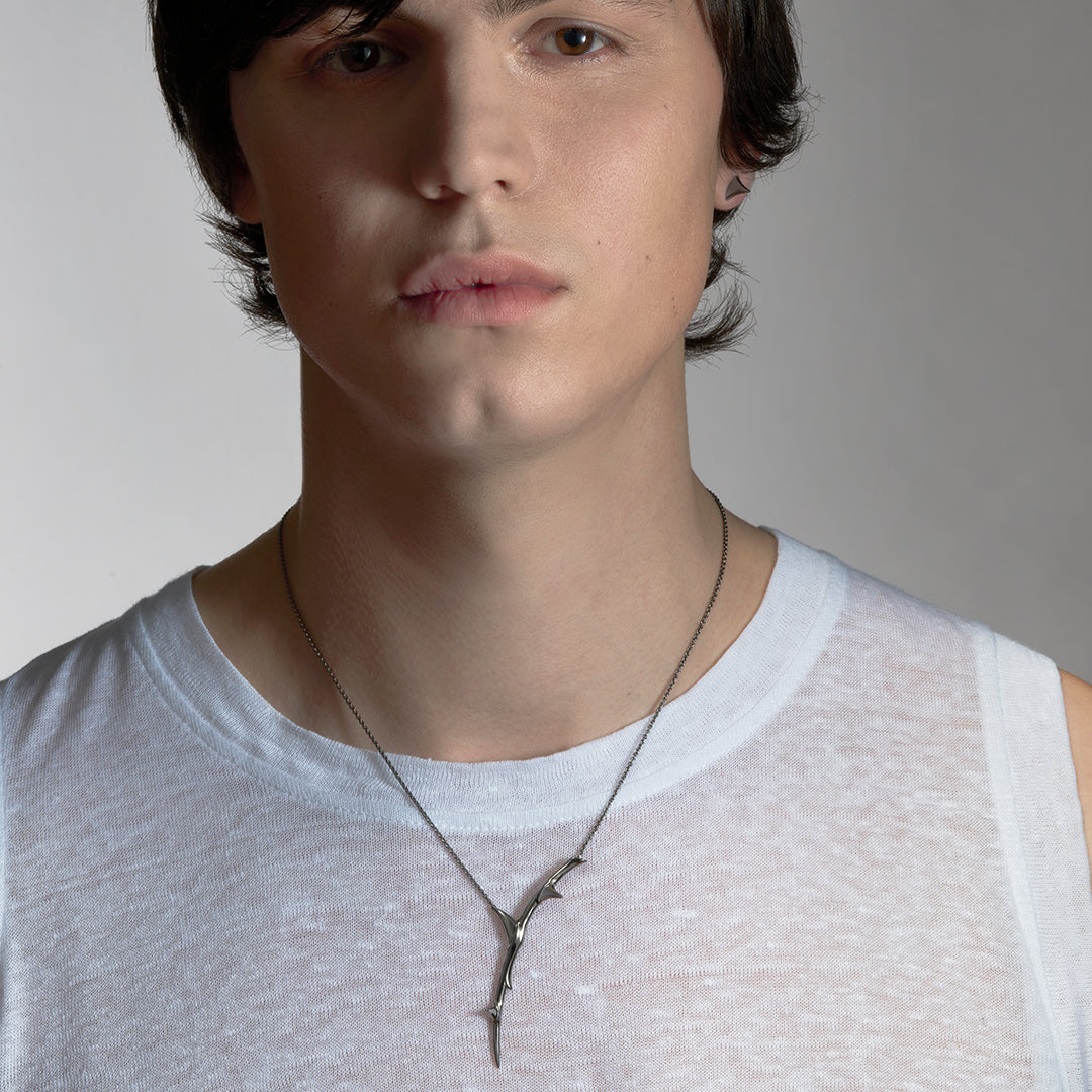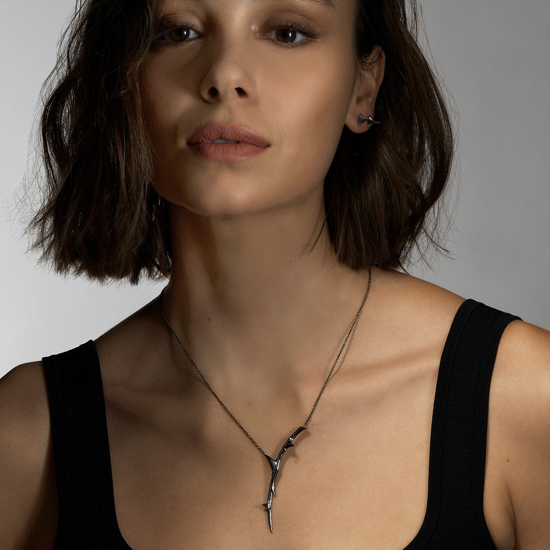 Rose Thorn's silver black rhodium metal vines drop to wrap around the neck. A pendant, replicating organic shapes found in nature, to ignite passion and desire.
