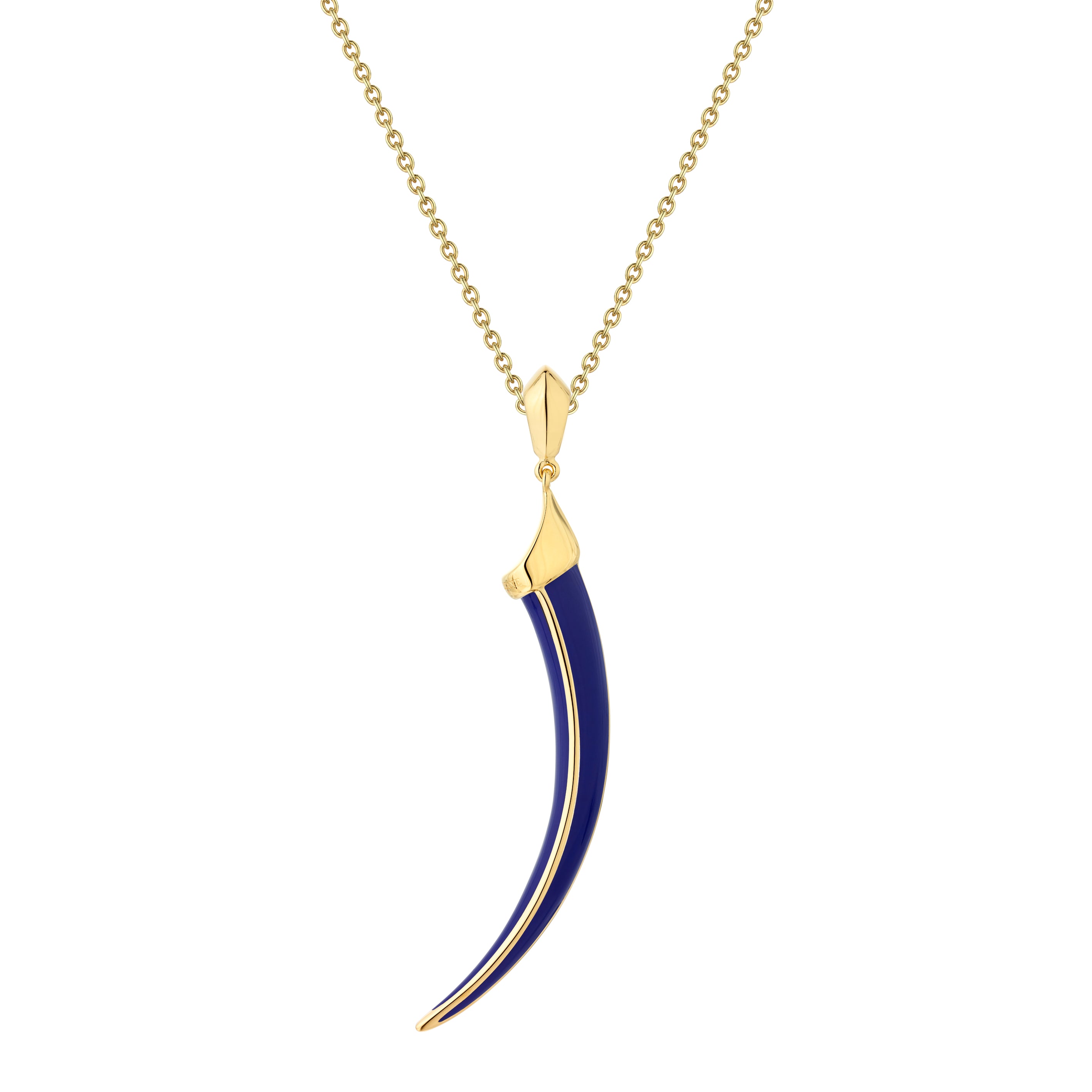 Sabre Solis Pendant is handcrafted from yellow gold vermeil and Atlantic coloured ceramic. Sabre Solis is Sabre's signature soaring line, with playful proportions and volume and bold bursts of colour. Worn long and languorous, an emboldened, solid Sabre silhouette suspends from a fluted cap to the torso, gently graduated and tapered to a soft point. Accentuating its curves, vibrant ceramic inlay showcases the knife-edge framed construction to perfection with a choice of rich-hued ceramics in natural tones. Fluid lines incorporate shape and movement with gestural sweeps of colour that reflect the changing effects of light - an effect of making colours move. Adjustable to different lengths on the colletage or threaded through twice and worn as a choker, our fine chains are handcrafted, subtle and elegant. Our House code, Line, inspires Sabre Solis, clean, minimal pieces that combine with ease. Shaun Leane's authority through line is evoked in beautifully simple, precise silhouettes in resplendent colour; bright, vigorous jewels to accumulate and wear with a joyful abundance.