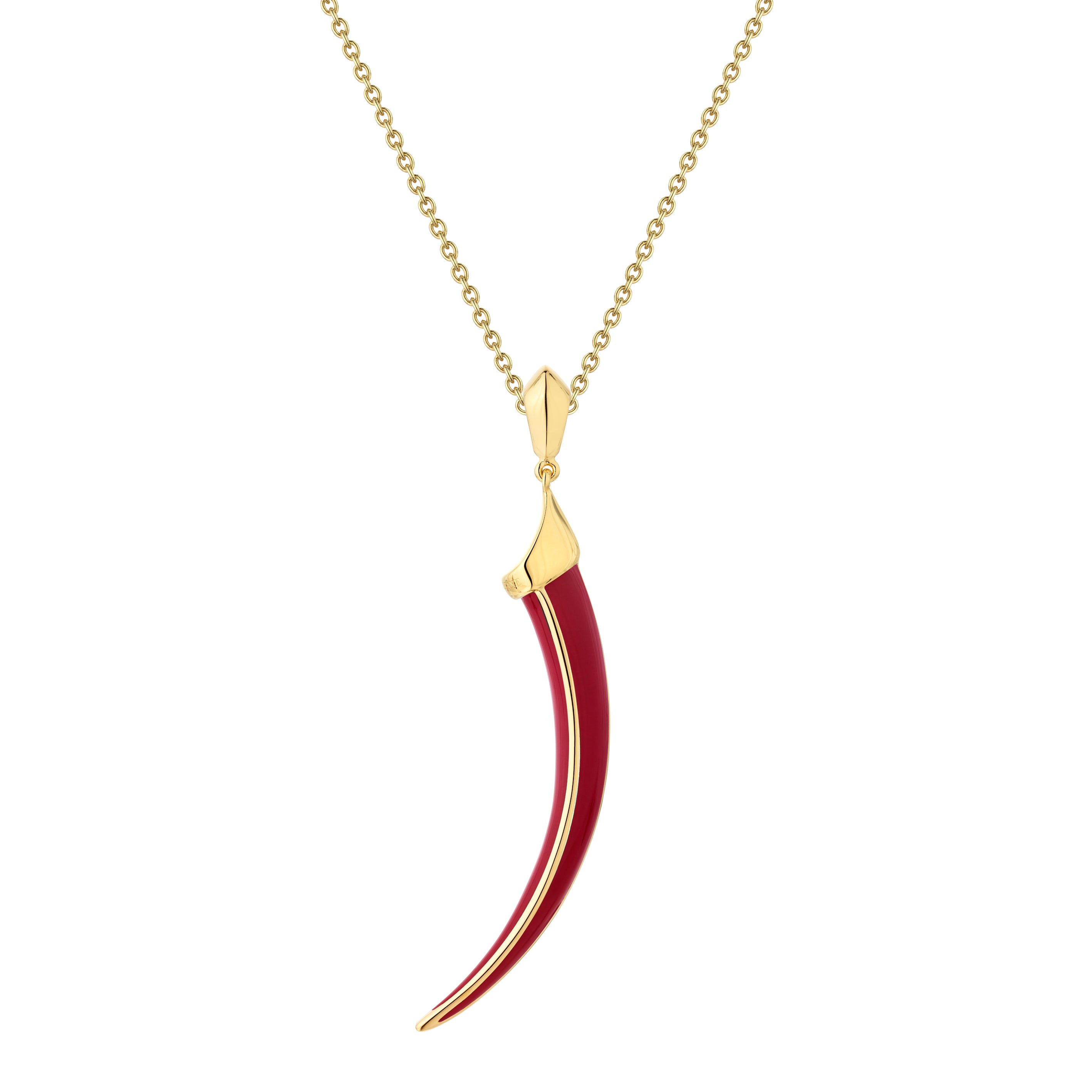 Sabre Solis Pendant is handcrafted from yellow gold vermeil and Sienna coloured ceramic. Sabre Solis is Sabre's signature soaring line, with playful proportions and volume and bold bursts of colour. Worn long and languorous, an emboldened, solid Sabre silhouette suspends from a fluted cap to the torso, gently graduated and tapered to a soft point. Accentuating its curves, vibrant ceramic inlay showcases the knife-edge framed construction to perfection with a choice of rich-hued ceramics in natural tones. Fluid lines incorporate shape and movement with gestural sweeps of colour that reflect the changing effects of light - an effect of making colours move. Adjustable to different lengths on the colletage or threaded through twice and worn as a choker, our fine chains are handcrafted, subtle and elegant. Our House code, Line, inspires Sabre Solis, clean, minimal pieces that combine with ease. Shaun Leane's authority through line is evoked in beautifully simple, precise silhouettes in resplendent colour; bright, vigorous jewels to accumulate and wear with a joyful abundance.