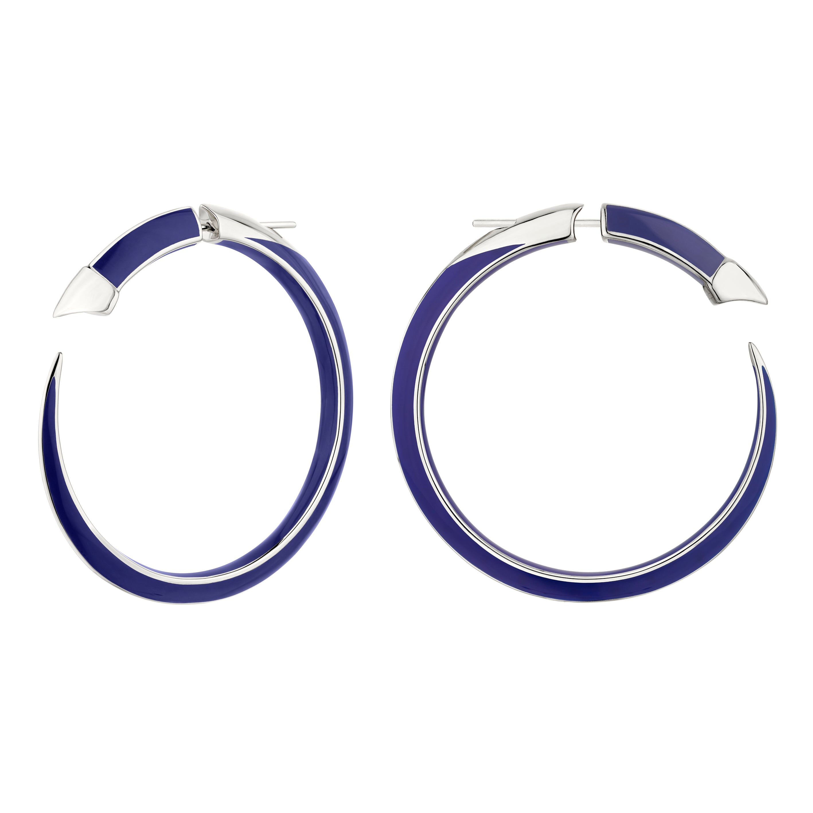 Sabre Solis Statement Hoop Earrings are handcrafted from sterling silver and Atlantic coloured ceramic. Sabre Solis is Sabre's signature soaring line, with playful proportions and volume and bold bursts of colour. Powerful glistening curves of sterling silver inlaid with vibrant ceramic form integrated silhouettes, orbiting the ear in an illustrious sweep with commanding sensuality. Executed front-to-back, Sabre Solis Statement Hoops' innovative design is a solid two-piece construction seamlessly fitting together, creating a fluid shape around the ear, crafted from exquisite materials with a choice of colourful ceramics. Gestural sweeps of curvilinear colour that reflect the changing effects of light, rich-hued ceramic inlay showcases their knife-edge framed construction to perfection. Tactile with carved edges and fluted caps you can run your fingers over, there are options for minimalist styles in solid sterling silver and yellow gold vermeil. Expert craftsmanship. Elevated and iconic.
