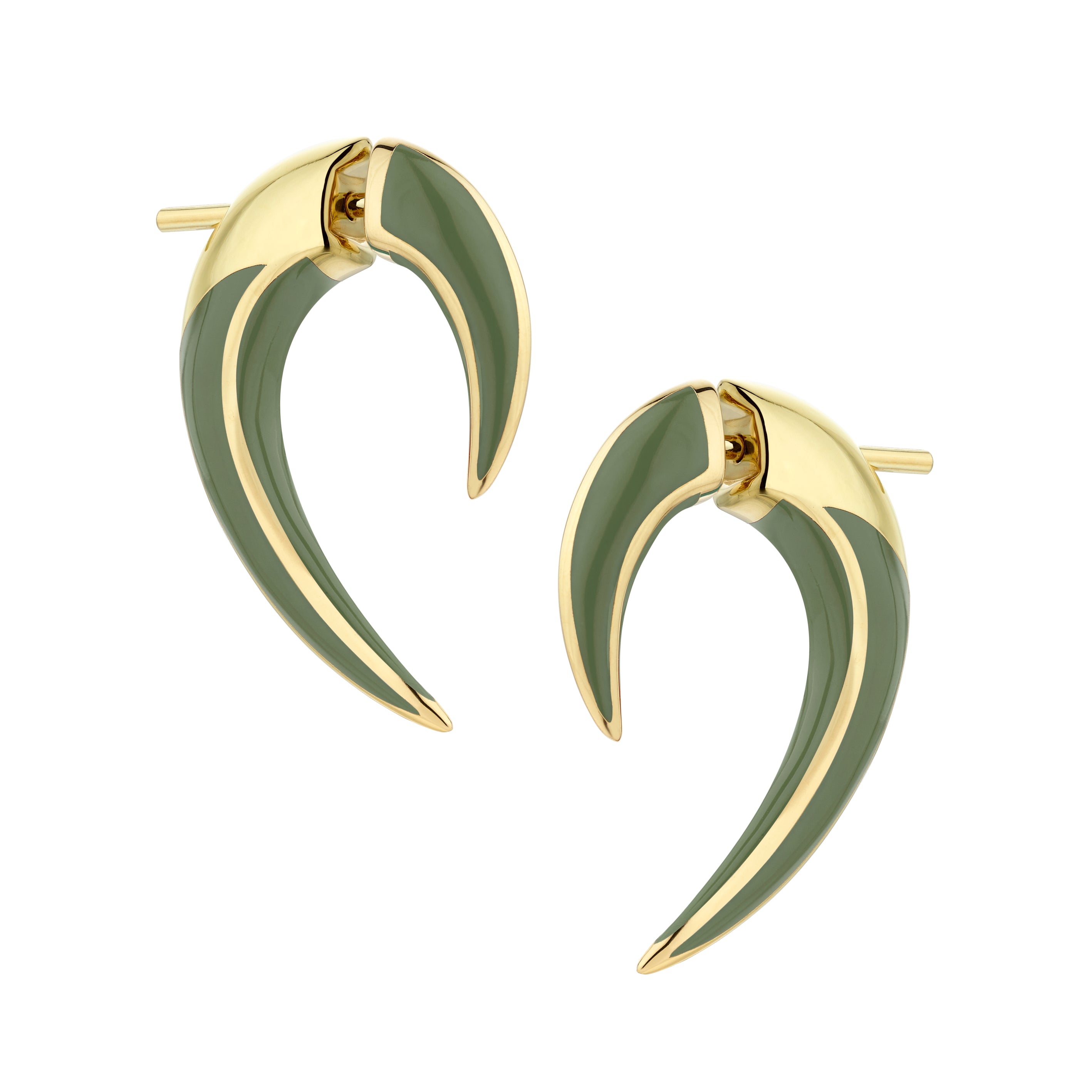 Sabre Solis Talon Earrings are handcrafted from yellow gold vermeil and Leaf coloured ceramic. Fantastically shaped glistening curves terminating in a sharp point, Sabre Solis Talons hug the ear in an elegant clasp. Their innovative design is a two-piece construction, seamlessly fitting together, creating a nuanced shape around the lobe, securely fastened in place. Sabre Solis is Sabre's signature soaring line, with playful proportions and volume and bold bursts of colour. Sabre Solis Talons are kinetic, integrated silhouettes, crafted from exquisite materials. Gestural sweeps of curvilinear colour that reflect the changing effects of light, rich-hued ceramic inlay showcases their knife-edge framed construction to perfection. Tactile with carved edges you can run your fingers over, there are options for minimalist styles in solid sterling silver and yellow gold vermeil. Designed to wear together in a joyful abundance, Sabre Solis Talon Earrings appeal to a fluid sensibility.