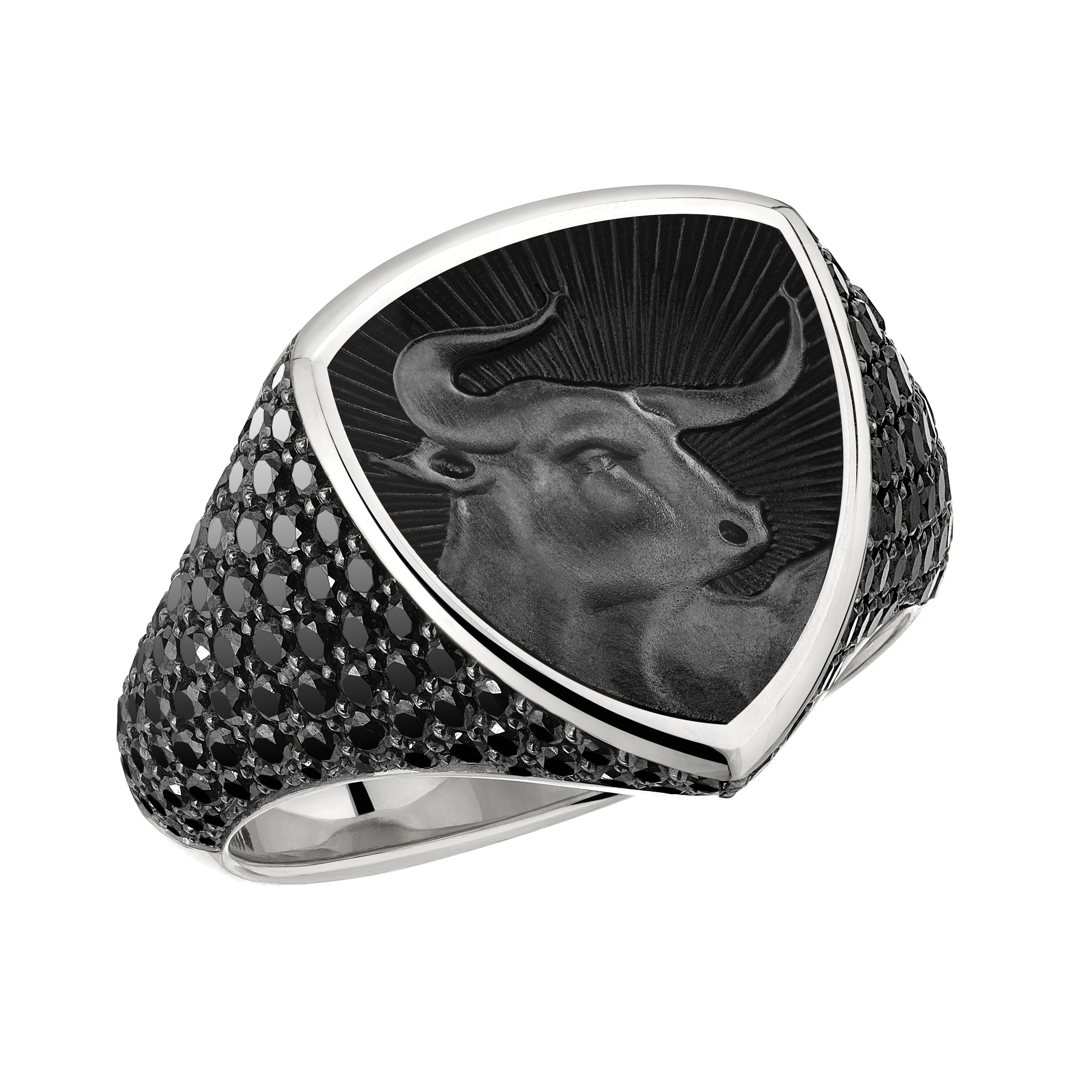 Signum Strength Bull Ring - 18ct White Gold & Black Diamond Nightfall Enamel