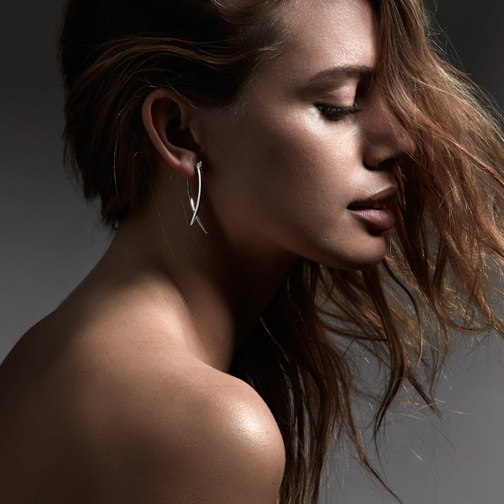 Sabre Crossover Earrings are handcrafted from sterling silver and 0.11cts of brilliant-cut white diamonds. The Sabre silhouette is a signature of the House of Shaun Leane, an elegant yet dangerous curve, designed to swoop the jawline and elongate the neck. Two symmetrical Sabre curves unite, tipped with precision-set pavé diamonds, illuminating the wearer. Our Sabre earrings are knife-edged, creating an hand-faceted surface - finished through 360 degrees - reflecting light from all angles. Designed with a left and right side and secured at the back with a butterfly, our diamond earrings transition effortlessly from day to evening.