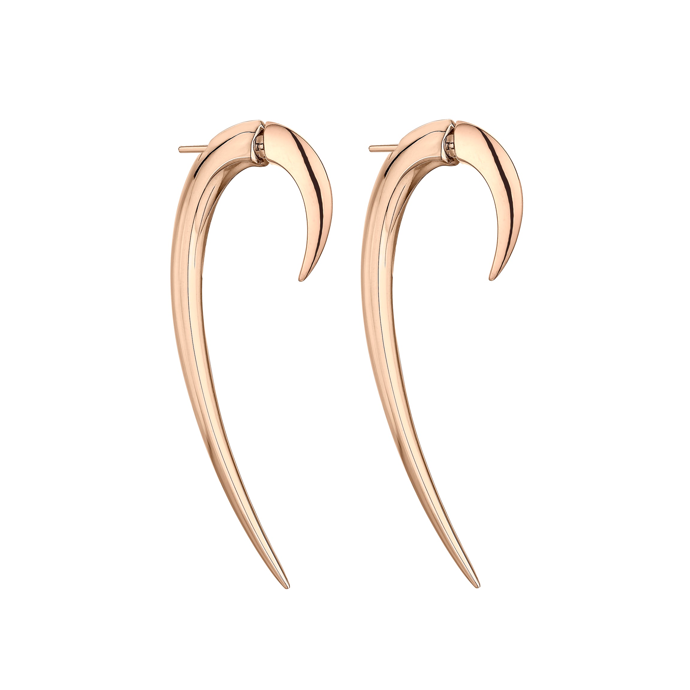 Hook Size 2 Earrings are handcrafted from rose gold vermeil, with a daring drop of 57mm. Hooks innovative design is a two-piece construction, seamlessly fitting together front to back, creating a refined shape around the ear, securely fastened in place. The Hook silhouette follows a powerful curvilinear line, taking inspiration from our House code, Line; a focus on singular shapes that transform into commanding showpieces. Defined by their knife-edge, creating light-refracting facets on the jewel that subtly draw the eye towards intimate areas of the body, like the line of the neck. In a Size 2, our Hooks are enhanced proportionally. Distinctive yet versatile, these are pieces you will want to keep wearing. Available as pairs and as single earrings.