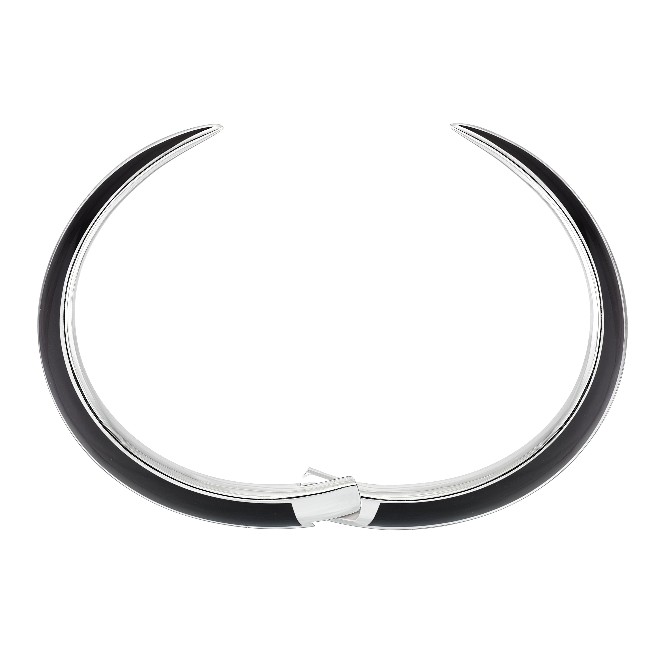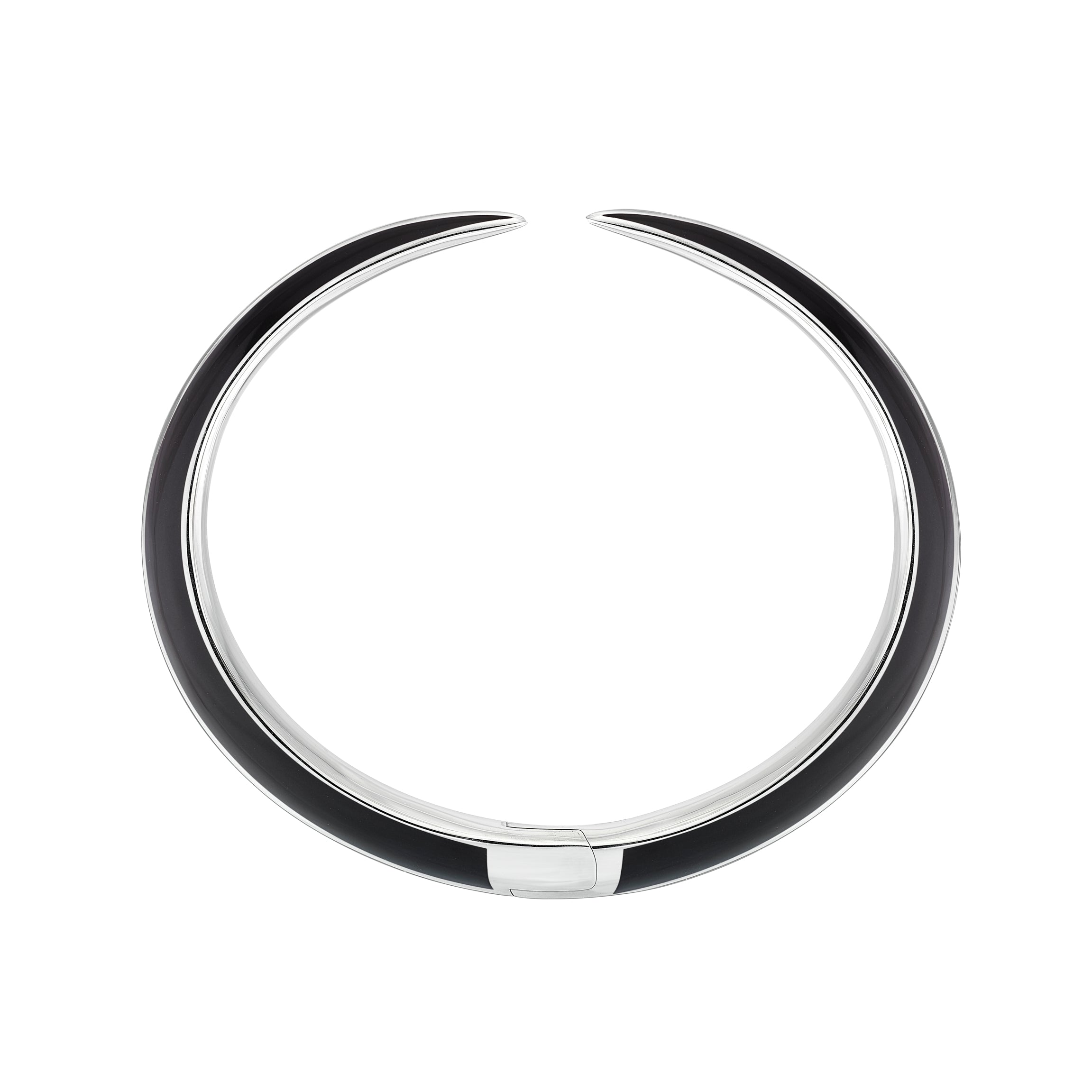 Sabre Deco Cuff Bangle is handcrafted from sterling silver and black ceramic. Sabre Deco is Sabre's powerful arc emboldened, combining a high-contrast of hybrid materials with couture elegance. With rounded, generous proportions and of some heft, an elegant curve of sterling silver encloses the wrist, with vibrant sweeps of black ceramic inlay, incorporating all of Sabre Deco's signatures; gentle graduations, snaked proportions, hand-grooved ridges and tapering at both ends to a gentle point. A discreet hinge mechanism allows for the cuff to be taken on and off with ease. Its fluid black lines incorporate shape and movement, gestural sweeps of colour that reflect the changing effects of light - an effect of making colours move. Sabre Deco pieces are bright, vigorous jewels, combining geometric materials to create simple, precise configurations. Delicate detailing such as hand-carved facades and a 360 degree knife-edge finish are exquisite touches. Our House code, Line, inspires a collection of engineered silhouettes, with sharp lines, architectural blocking, stature and solidity all hallmarks of Shaun Leane's take on modernism for the 21st century.