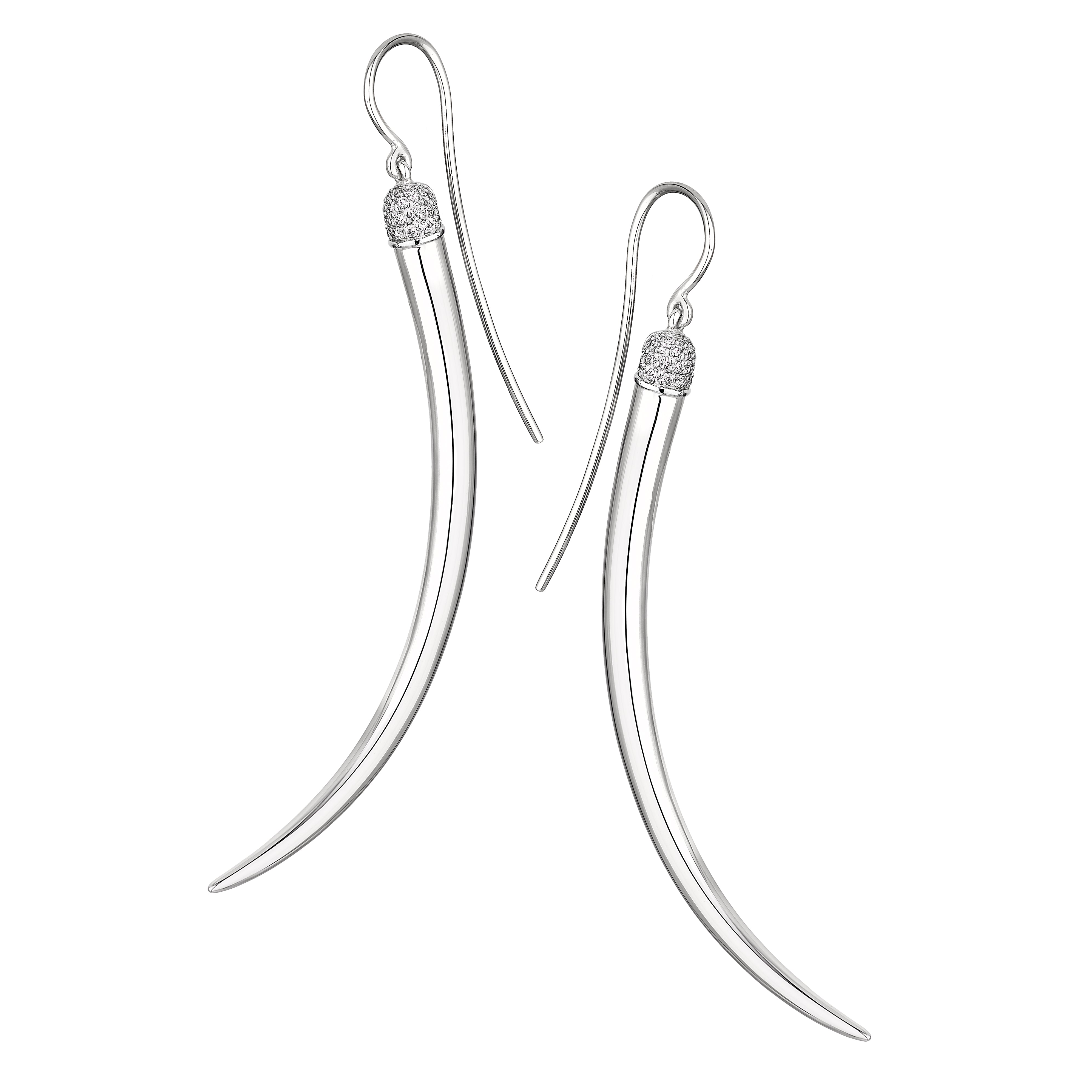 Iconic, the No.1 long earring is the first piece Shaun created for McQueen’s show ‘The Hunger’. From the catwalk to the wearer, reimagined as a diamond earring, a signature curve that frames the face of a daring icon. Crafted in sterling silver, featuring a bold shepherd's hook fastening and a pave diamond touch, an ultimate couture silhouette.