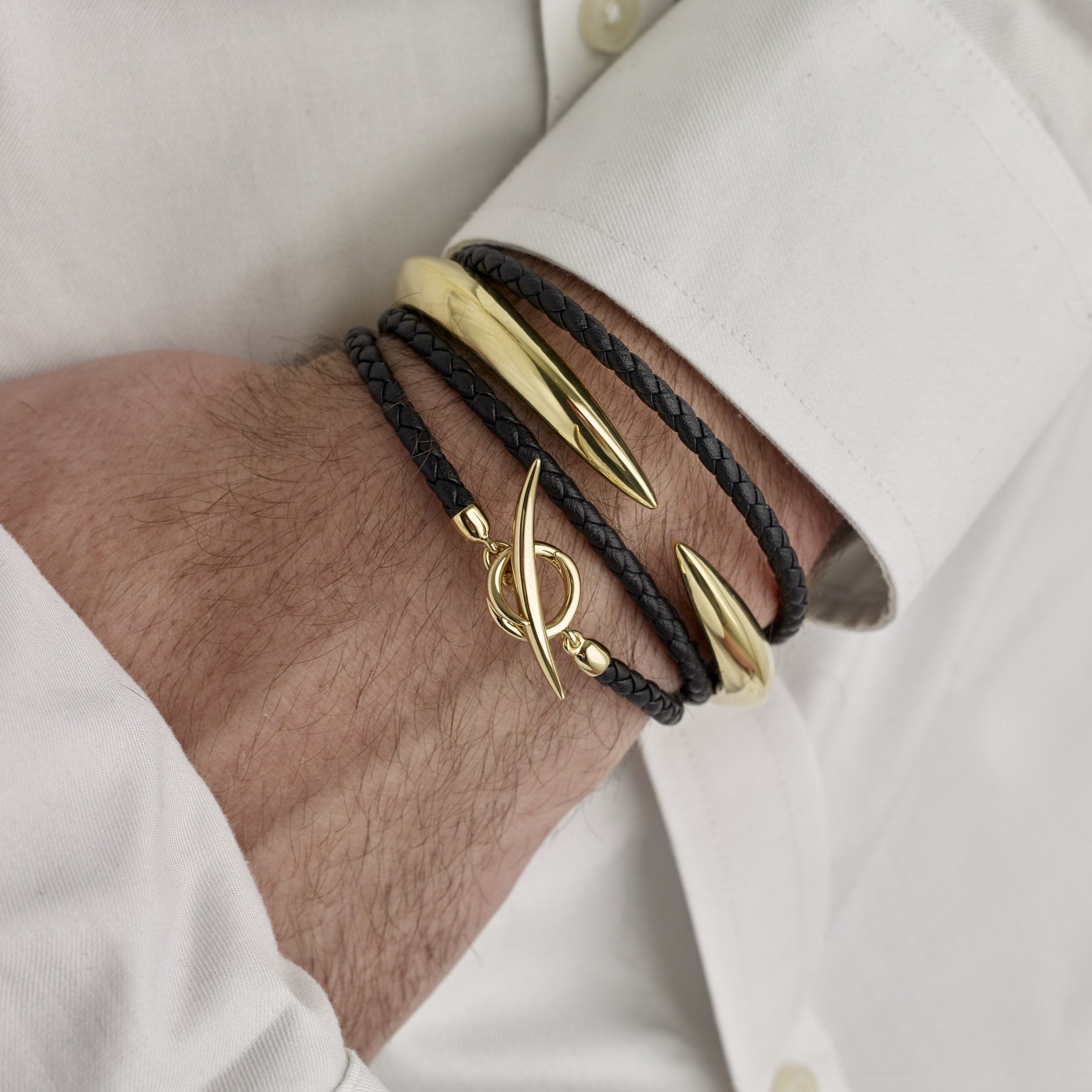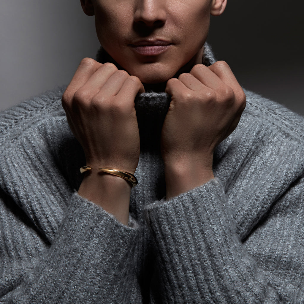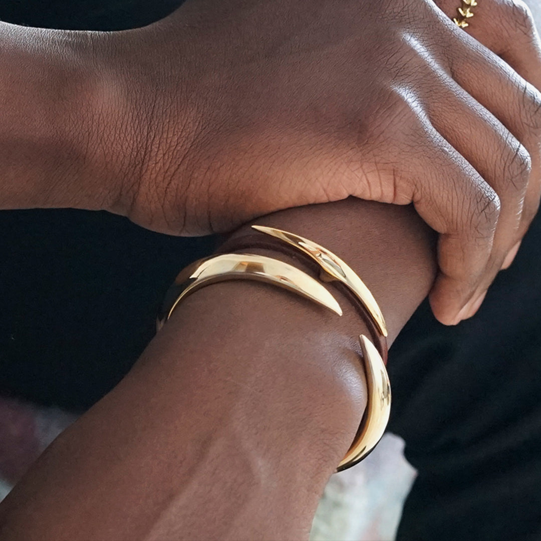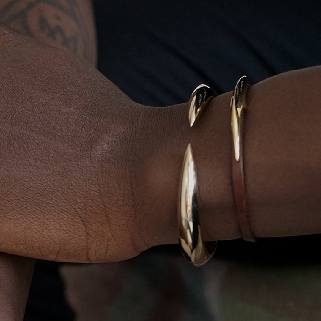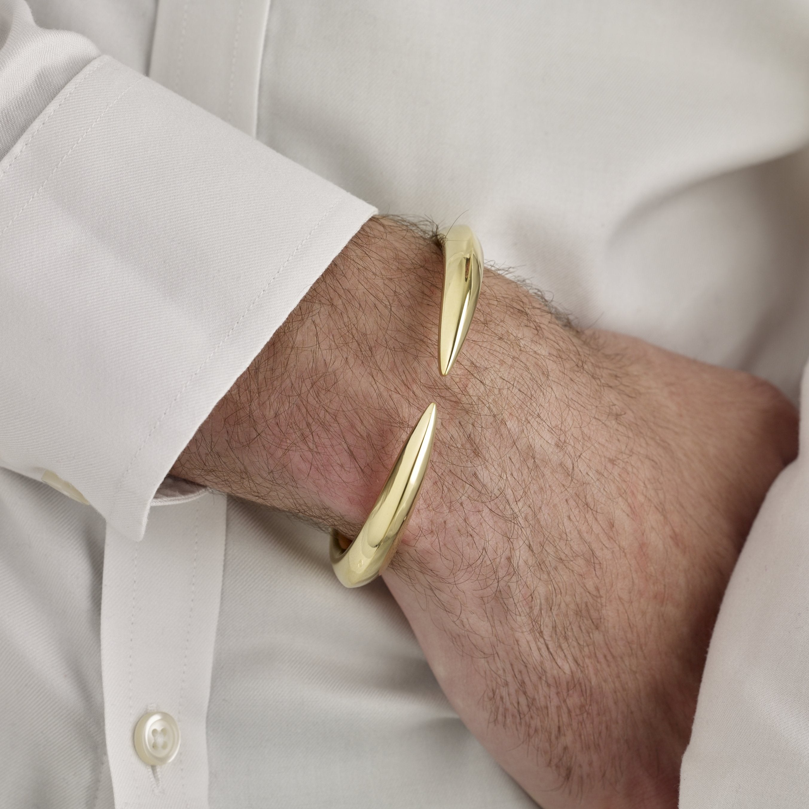 Arc Bangle is handcrafted from yellow gold vermeil. Arc is a transformative collection of clean, architectural pieces that follow a continual movement along the body, available in sterling silver and yellow gold vermeil finishes. Generously proportioned, delivering weight within a clean minimalist design, a yellow gold vermeil Arc silhouette sweeps the wrist, a contoured ergonomic shape that suggests momentum graduating to fine points. Designed to feel solid on the wrist, a magnetic clasp and discreet hinge mechanism make the wearing effortless. Arc bangles are articulated, refined pieces that a fluid movement; gestural sweeps of resplendent silver, or yellow gold vermeil, with a dynamic edge - the Shaun Leane sharp-pointed silhouette. The knife-edge is key, providing clarity to edges and softly angling light, drawing the eye towards intimate areas of the body, like the line of the neck or the contours of the décolletage. Clean minimalism made sensual, Arc is in the balance - technical jewels with transformative power.