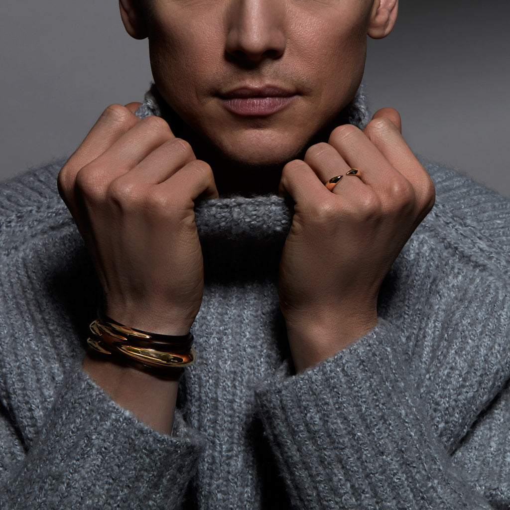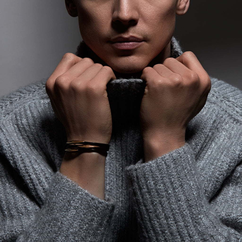 The layered effect of this mens leather bracelet provides a rich textural contrast against polished yellow gold vermeil accents. This sophisticated gold bracelet for men is finished with a magnetic clasp for effortless fastening. Available in black leather with silver and as a single wrap, this mens bracelet can be paired with the Arc Ring or Arc Pendant for a coordinated look.