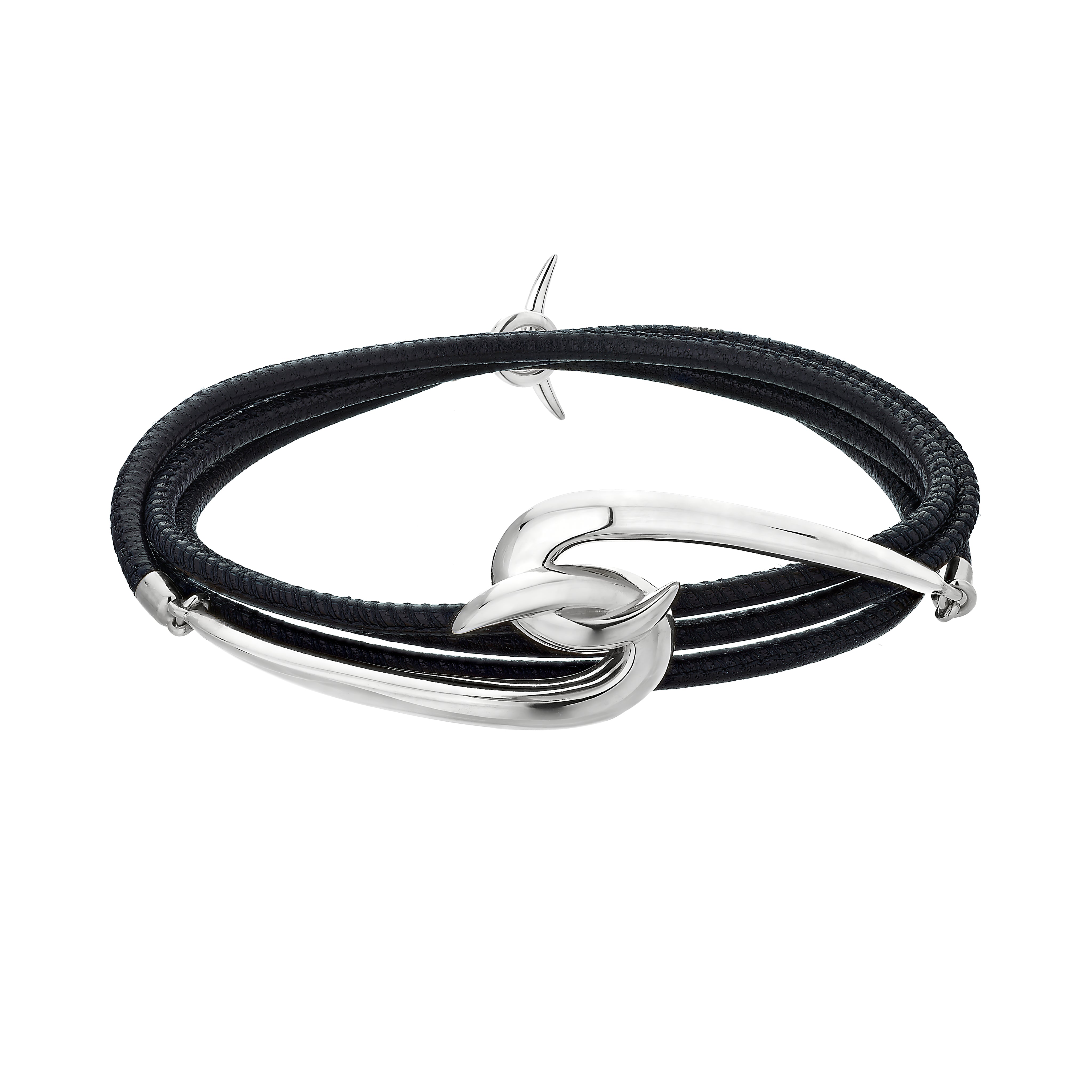 Handcrafted from sterling silver and supple black calf's leather, the Hook Bracelet's sensuality is in its playful mix of materials. Two enclosing silver Hooks form a connected silhouette, secured in place with a soft black calf's leather cord, fastened at the back with our sterling silver signature Shaun Leane T-bar fastening. Hook takes inspiration from our House code, Line; a focus on singular shapes, in a collection of tactile pieces, beautifully made - with the defining knife-edge, creating light refracting facets on the jewels surface. Our Hook Bracelet follows the line of the wrist, sensitive to your movements, its ridges delicate enough to run your fingers over.