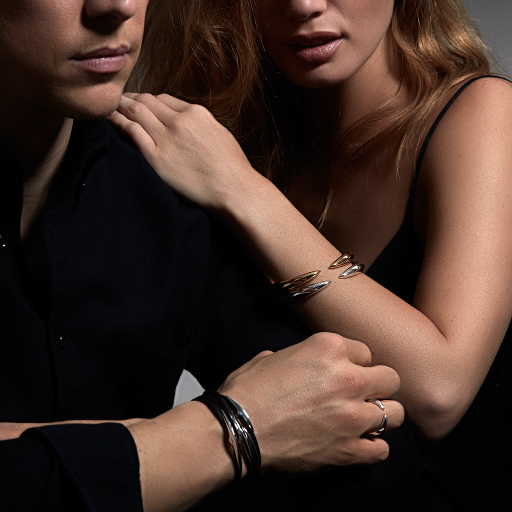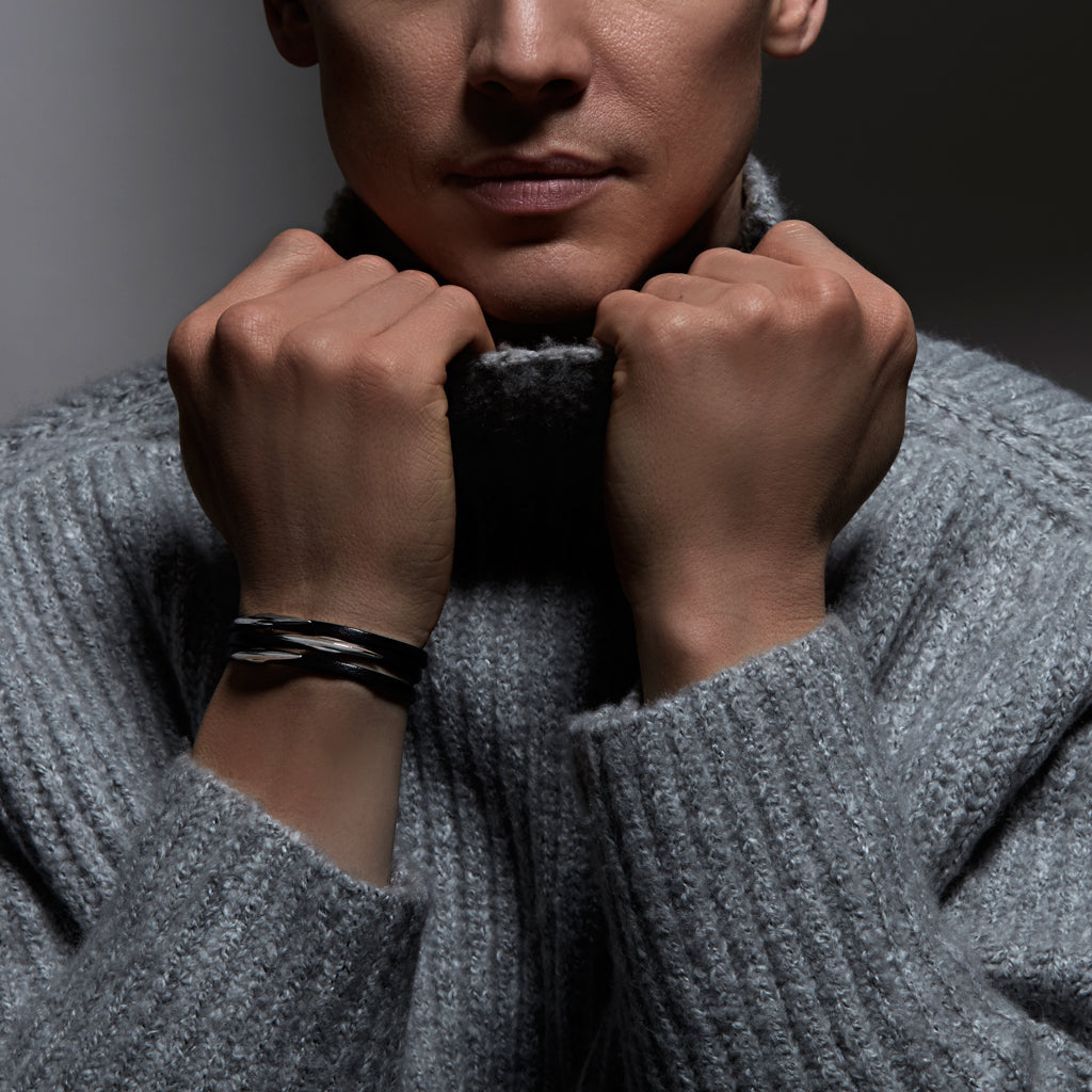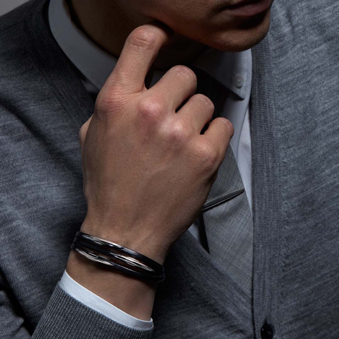 The layered effect of this mens leather bracelet provides a rich textural contrast against polished sterling silver accents. This sophisticated silver bracelet for men is finished with a magnetic clasp for effortless fastening. Available in brown leather with gold and as a single wrap, this mens bracelet can be paired with the Arc Ring or Arc Pendant for a coordinated look.