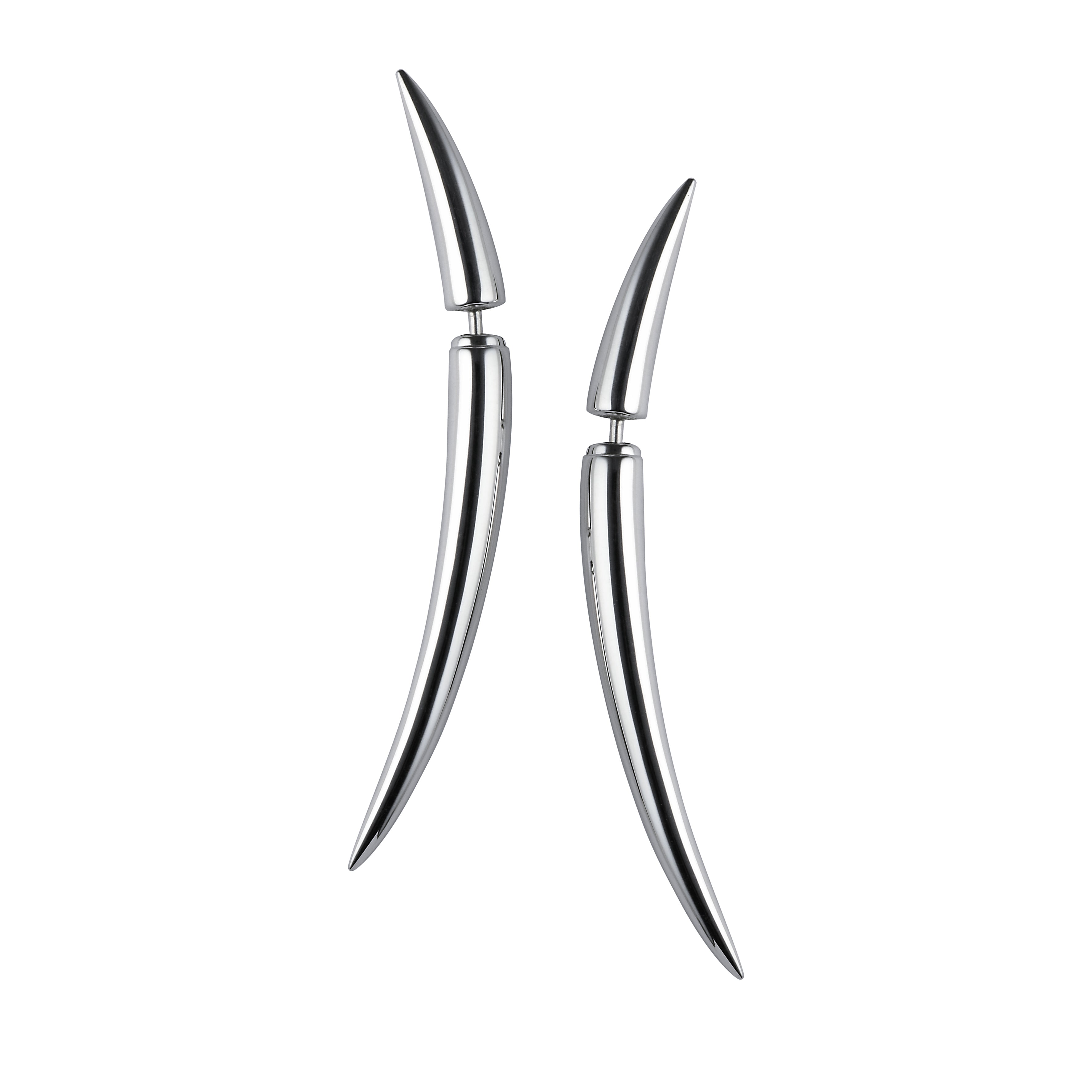 Quill Earrings are handcrafted from sterling silver. The double-edged Quill is an elegant yet dangerous curve. Created for the Alexander McQueen SS03 show, Irene, it was an expansion of the pointed aesthetic Leane curated in the 90s. The porcupine-inspired shape is reverent to our House code: Line, dramatic spikes, androgynous cuts with a modern sensibility. Distilled, here, into powerful silver earrings, Quill's curvilinear lines are softened, with symmetrical framing of the face and an elongated neck, creating drama and dynamism. Designed as a two-piece construction, with a left and a right side and an elegant drop of 36mm - a compact, subtle length. Available as singles, in standard or large sizes.