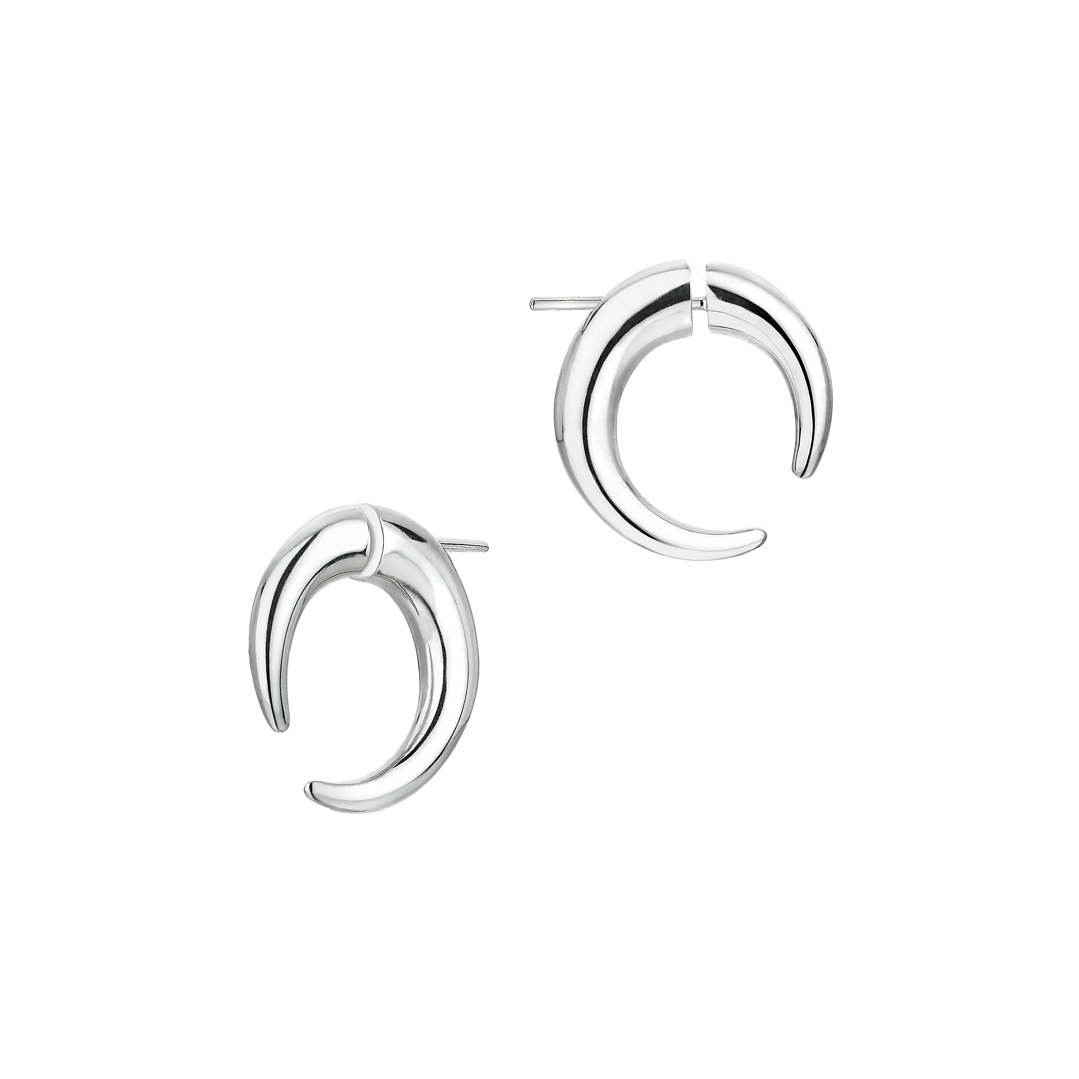 Handcrafted from sterling silver, Talon Small Hoop Earrings are a unique alternative to silver hooped earrings. Talon's innovative design is a two-piece construction, seamlessly fitting together, creating a nuanced shape around the ear, securely fastened in place. Our Talon Small Hoops follow a rounded, bulbous silhouette, tapered front to back, gently flattened then graduated, hugging the ear in an elegant clasp. Designed with a left and right side, Talon Hoops curve away from the face, embodying the creatures and forms that come alive in the pink dusk. Talon sits at the heart of our House code, Fauna; a focus on organic silhouettes - fossils, feathers, bones and claws - jewels with an aura, rendered with care and precision. In smaller sizes, our Talon Hoops are bejewelled curiosities, versatile, easy-to-wear pieces and some of our bestsellers. Layer up with larger Talon Hoops, or keep it simple.