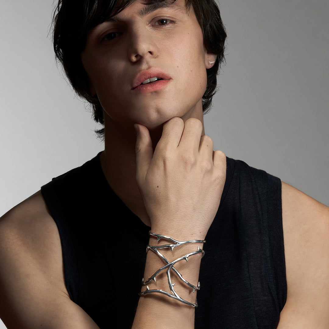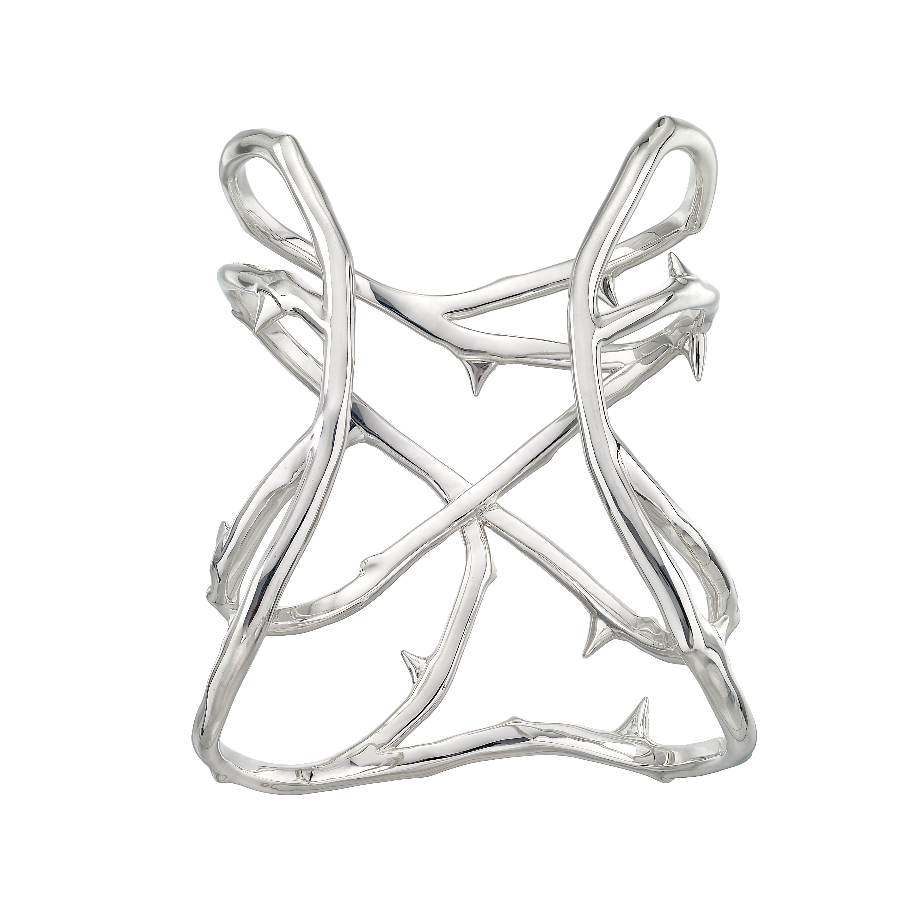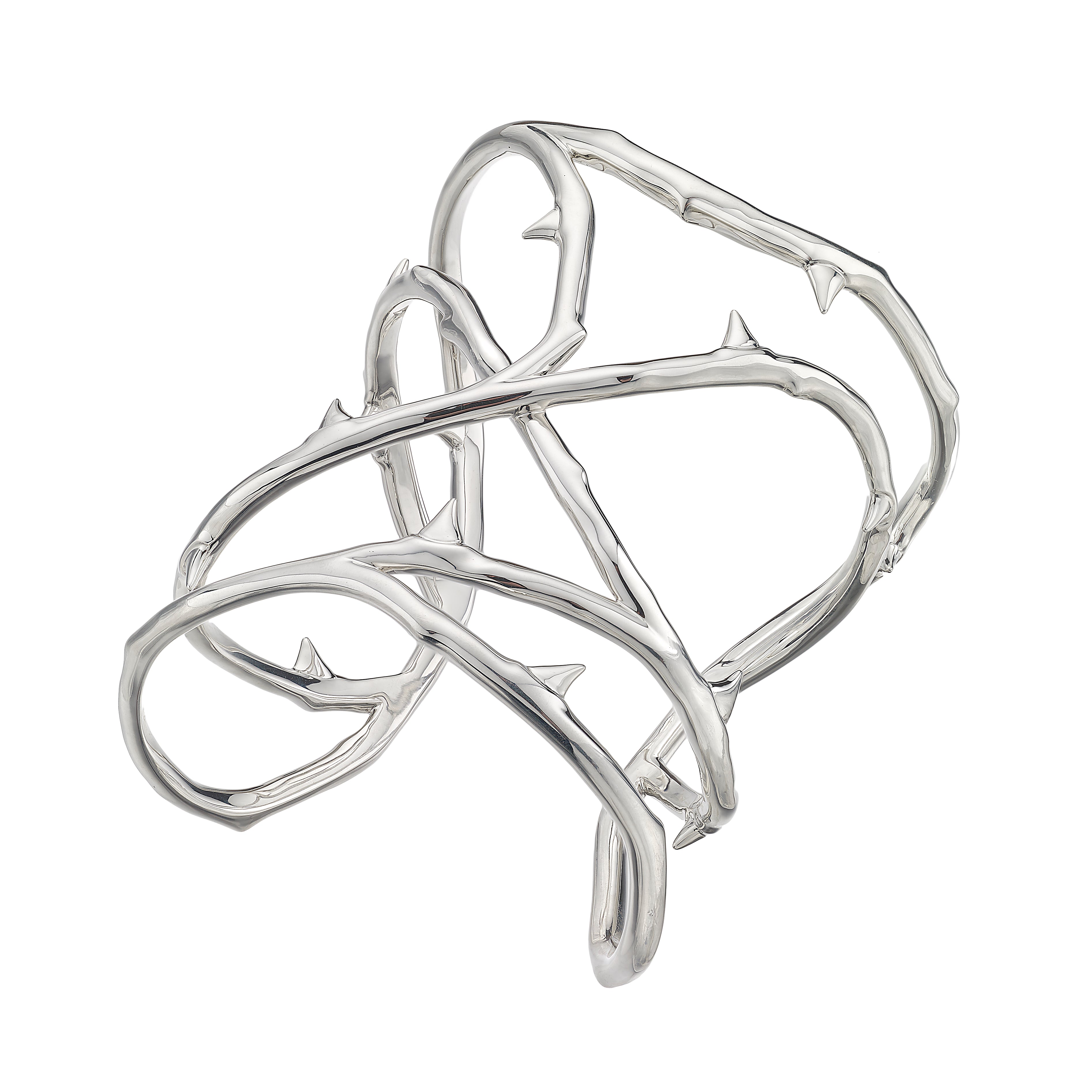 Rose Thorn Cuff is handcrafted from sterling silver. In Rose Thorn, Shaun Leane's free and melodious style takes on a fuller, richer life. A glistening web of riveted, thorn-strewn burly vines in sterling silver enclose the wrist, creating a resplendent slip-on cuff, perfectly shaped to your wrist and tapered to your arm. Metallic, illustrious, in sculpted yellow gold vermeil, Rose Thorn's metal vines metamorphose into a modern-day armour, a powerful statement in magical fantasy. Rose Thorn pieces are an explosion of texture and tactility, with thorny spikes and wide-veined, rounded ridges that are beautiful to touch. The weight of the jewels and the variety of scale replicate shapes found in nature. Rose Thorn sits at the heart of our House code, Flora; a celebration of botanical beauty that is the symbiosis of Leane's emotive handwriting. Otherworldly protection through elegance. Available in a variety of precious metal finishes.