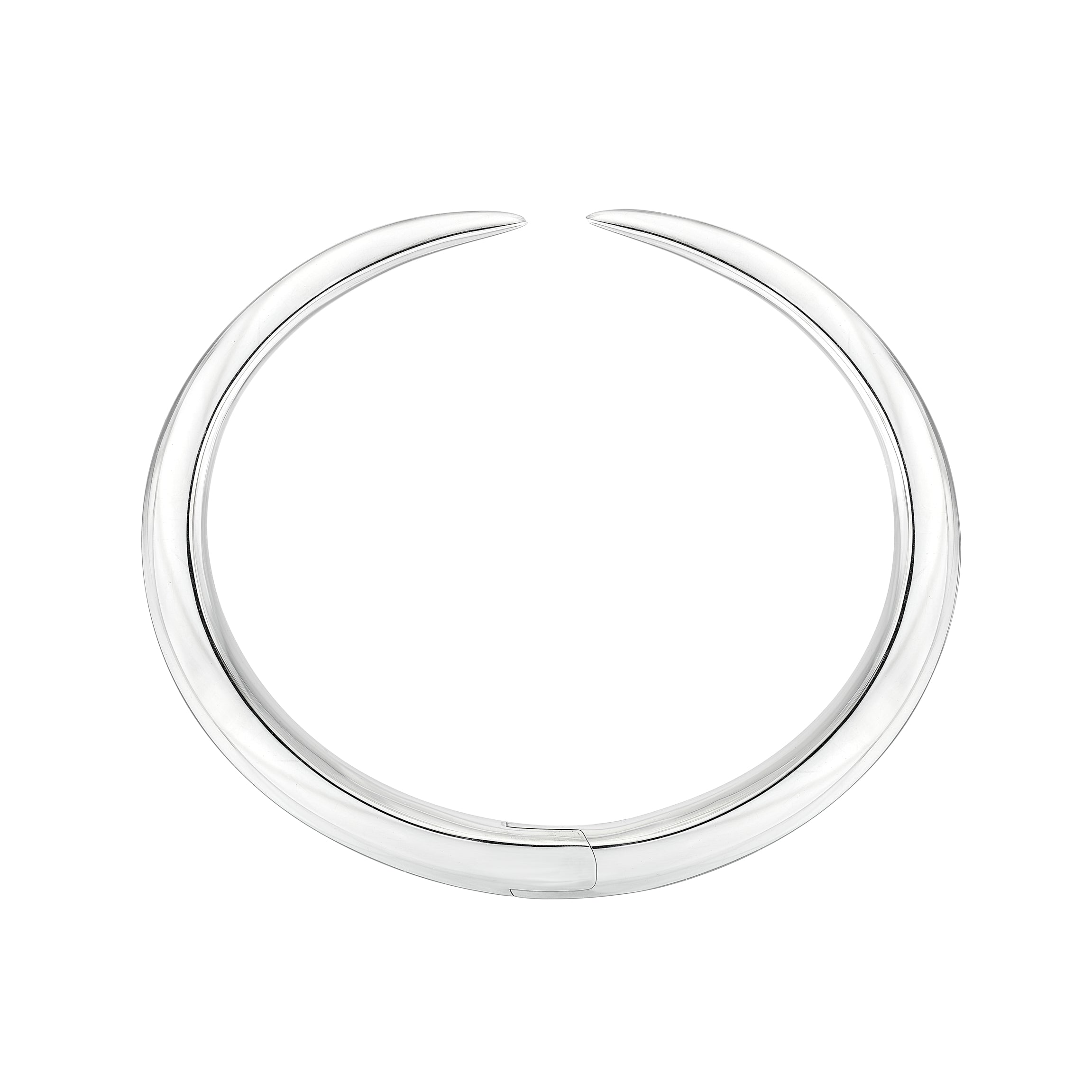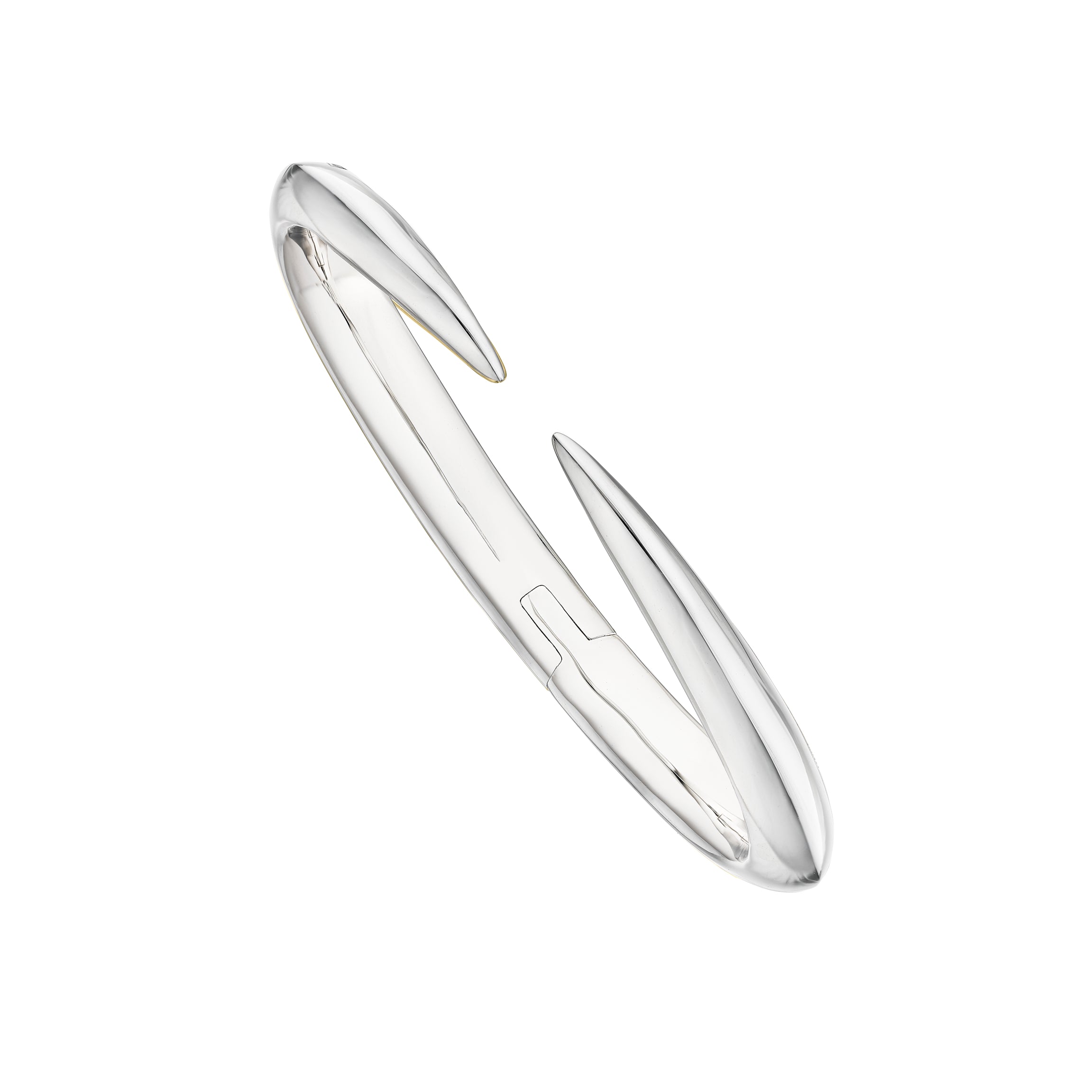 Sabre Deco Cuff Bangle is handcrafted from sterling silver. Sabre Deco is Sabre's powerful arc emboldened, combining a high-contrast of hybrid materials with couture elegance. With rounded, generous proportions and of some heft, an elegant curve of sterling silver encloses the wrist incorporating all of Sabre Deco's signatures; gentle graduations, snaked proportions, hand-grooved ridges and tapering at both ends to a gentle point. A discreet hinge mechanism allows for the cuff to be taken on and off with ease. Sabre Deco pieces are bright, vigorous jewels, combining geometric materials to create simple, precise configurations. Delicate detailing such as hand-carved facades and a 360 degree knife-edge finish are exquisite touches. Our House code, Line, inspires a collection of engineered silhouettes, with sharp lines, architectural blocking, stature and solidity all hallmarks of Shaun Leane's take on modernism for the 21st century.