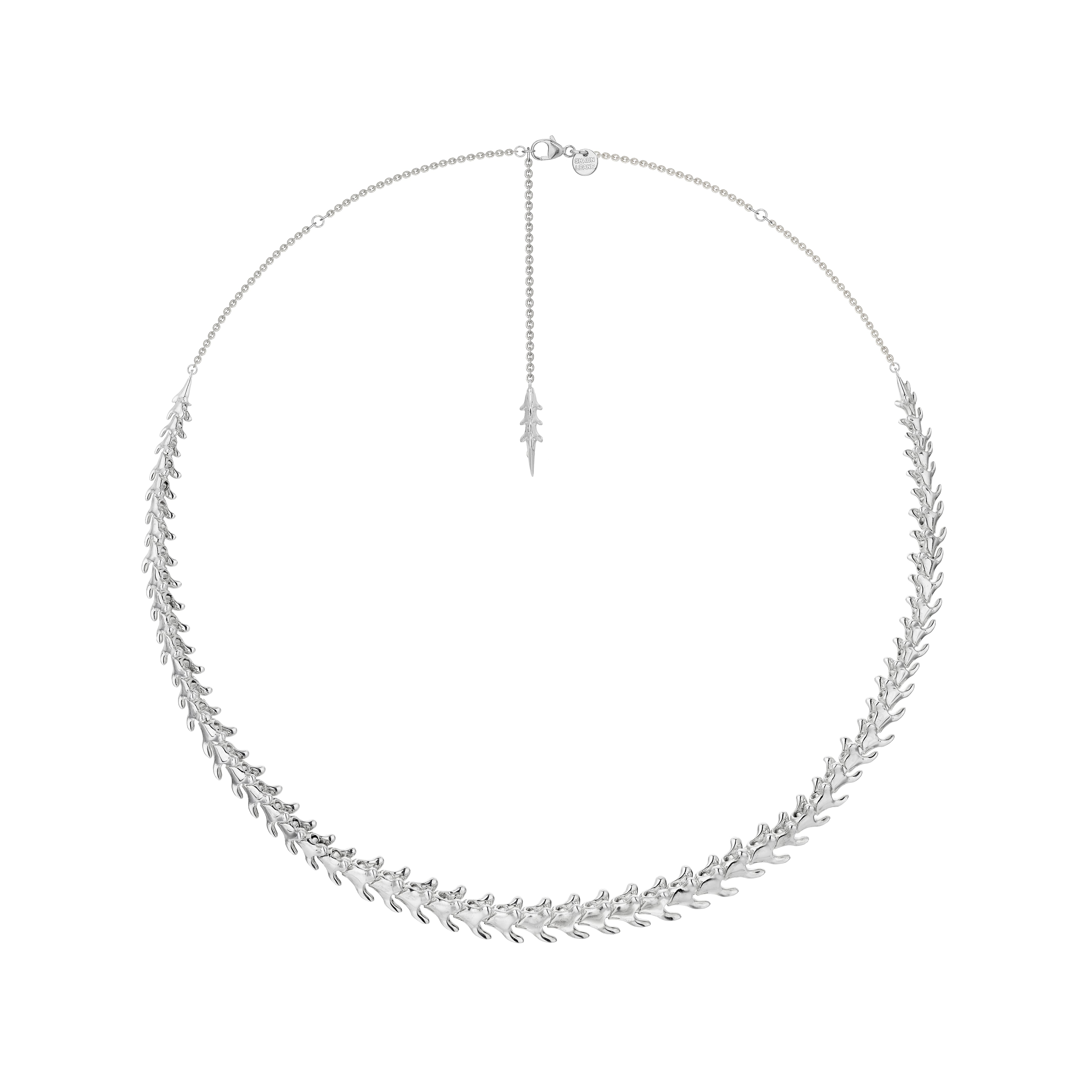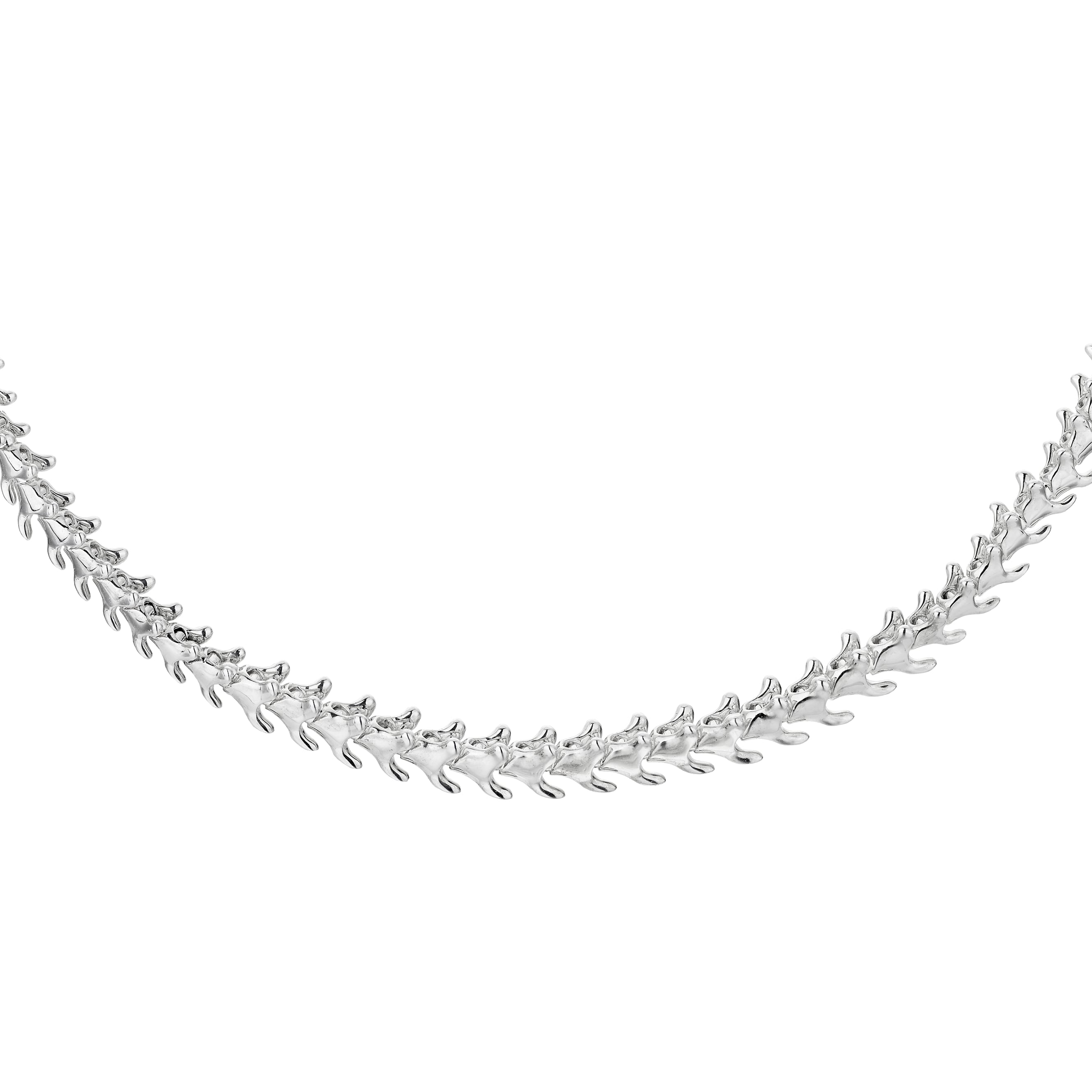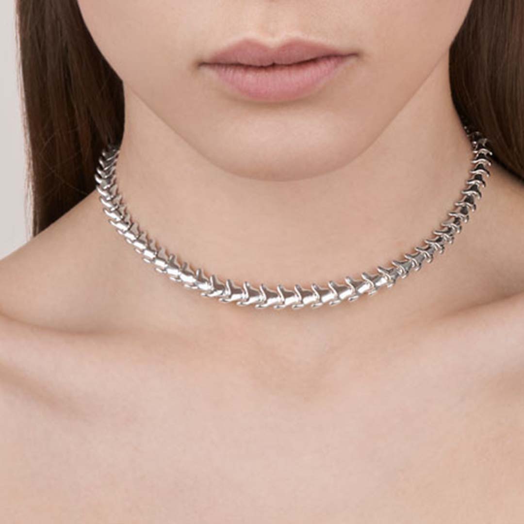 Handcrafted from sterling silver, our Serpent's Trace Choker is from the House of Shaun Leane's avant-garde collection of bejewelled snake endoskeletons that wrap around wrists, enclose necks and sway from earlobes. Articulated structures of sterling silver bone effect the serpent undulating around your neck - ear to ear - coiled to your collarbone. Perfectly graduated and tapered at each side, with a subtle diameter of 7mm, our slimline Serpent's Trace Choker is held either side by the finest of chains, adjustable to four lengths. These are supple, playful, kinetic jewels, moving in sync with the wearer, embodying the human experience, reflecting the beguiling legend of the mythological serpent.