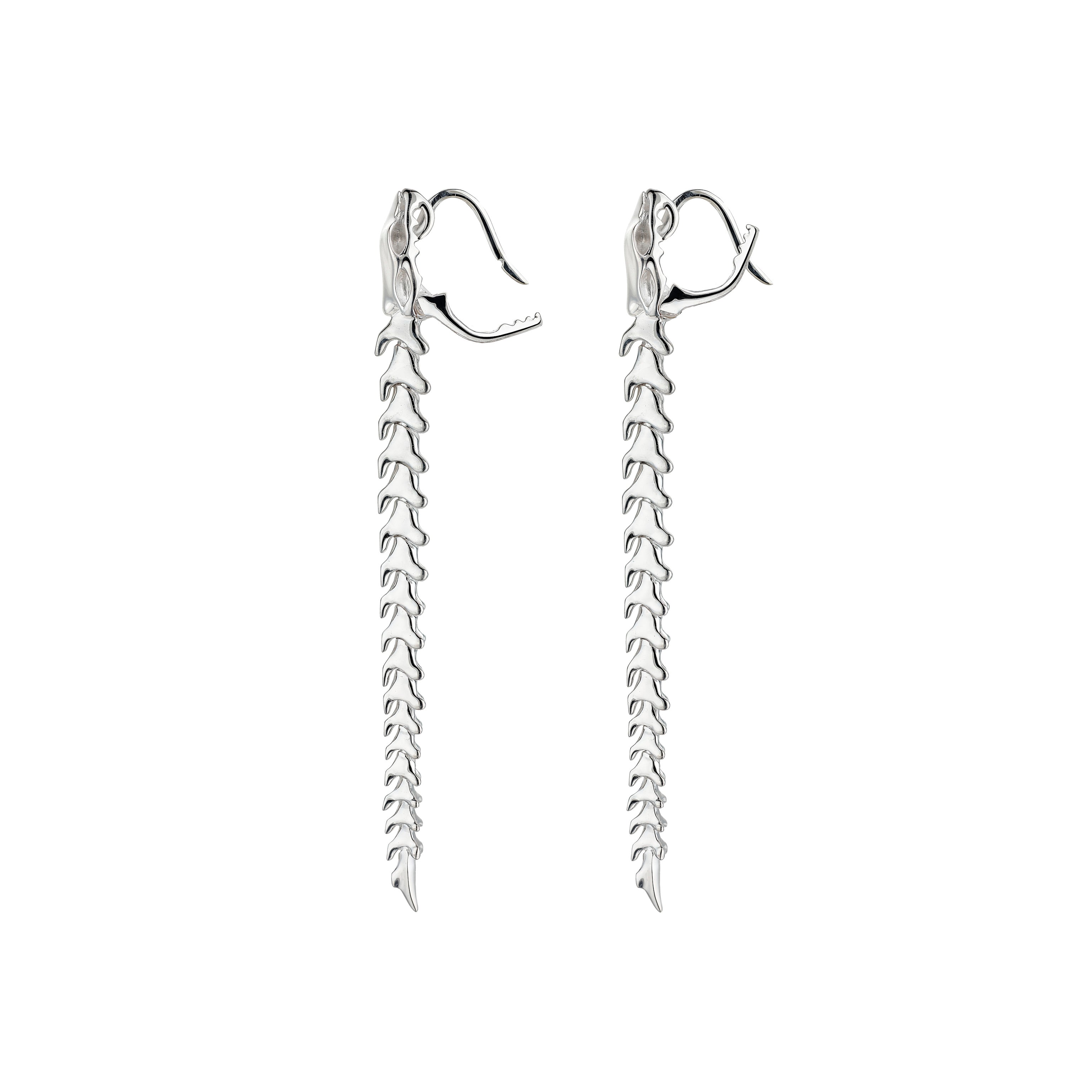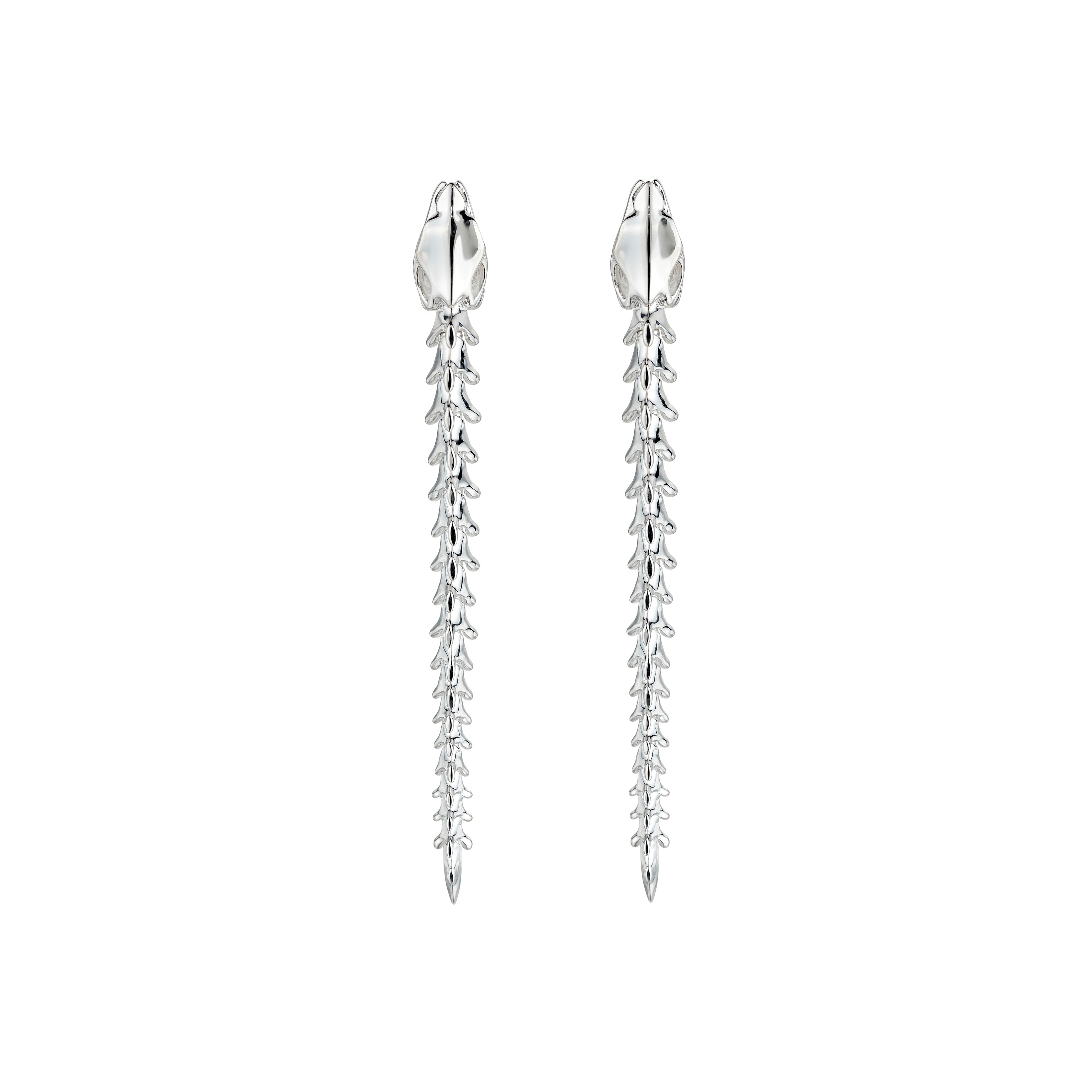 Handcrafted from sterling silver, our Serpent's Trace Drop Earrings take inspiration from the aluminium Coiled Corset Shaun Leane made for Alexander McQueen. Perfectly graduated vertebrae of articulated sterling silver pieces of boneattach to the ear from the bejewelled jaws of the serpent's skull. Each piece of bonehas it own precise movement, conjuring the hypnotic slither of the serpent as the earrings sway, catching the light. Combining traditional goldsmithing with an eye for the avant-garde, the Serpent silhouette took our Mayfair team of trained goldsmiths four years to perfect. Our spin on evening drop earrings are supple, playful, kinetic jewels that move with the wearer. They are the ultimate statement in glamour. Also available with diamonds.