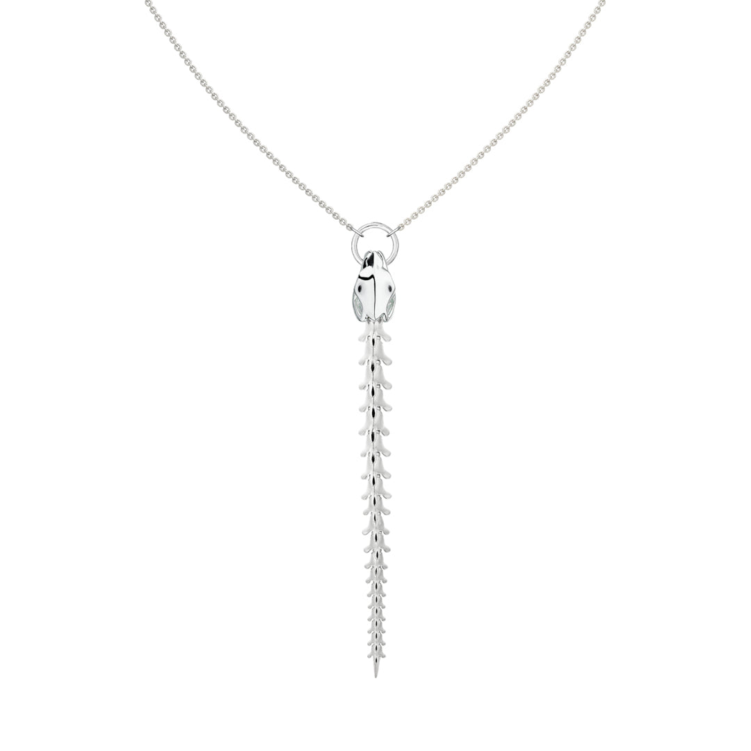 Handcrafted from sterling silver, our Serpent's Trace Drop Pendant takes inspiration from the aluminium Coiled Corset Shaun Leane made for Alexander McQueen. A single perfectly graduated vertebrae of articulated sterling silver pieces of bonesuspend the colletage, ensnared in the bejewelled jaws of the serpent's skull. Designed to move with the wearer, each piece of gilded bonehas its own precise movement, conjuring the hypnotic slither of the serpent as it sways, catching the light. The piece becomes a breathing work of art, sinuously moving across the collarbone. Mechanical, light-reflecting, technically dazzling, the Serpent silhouette took our Mayfair team of trained goldsmiths four years to perfect. Leane's creations breathe life into a mythological legend. Adjustable to individual three lengths. Also available with diamonds.