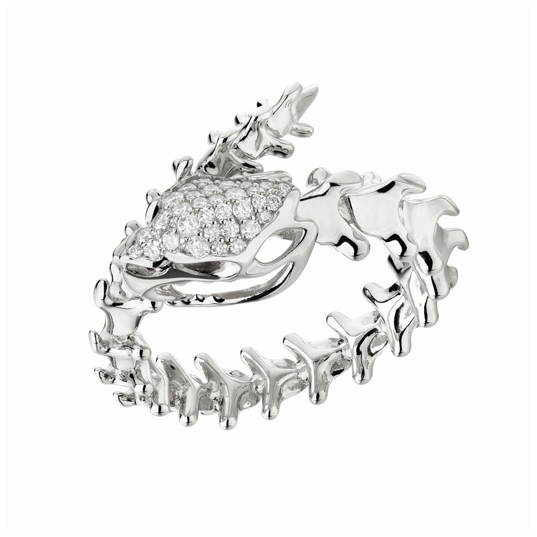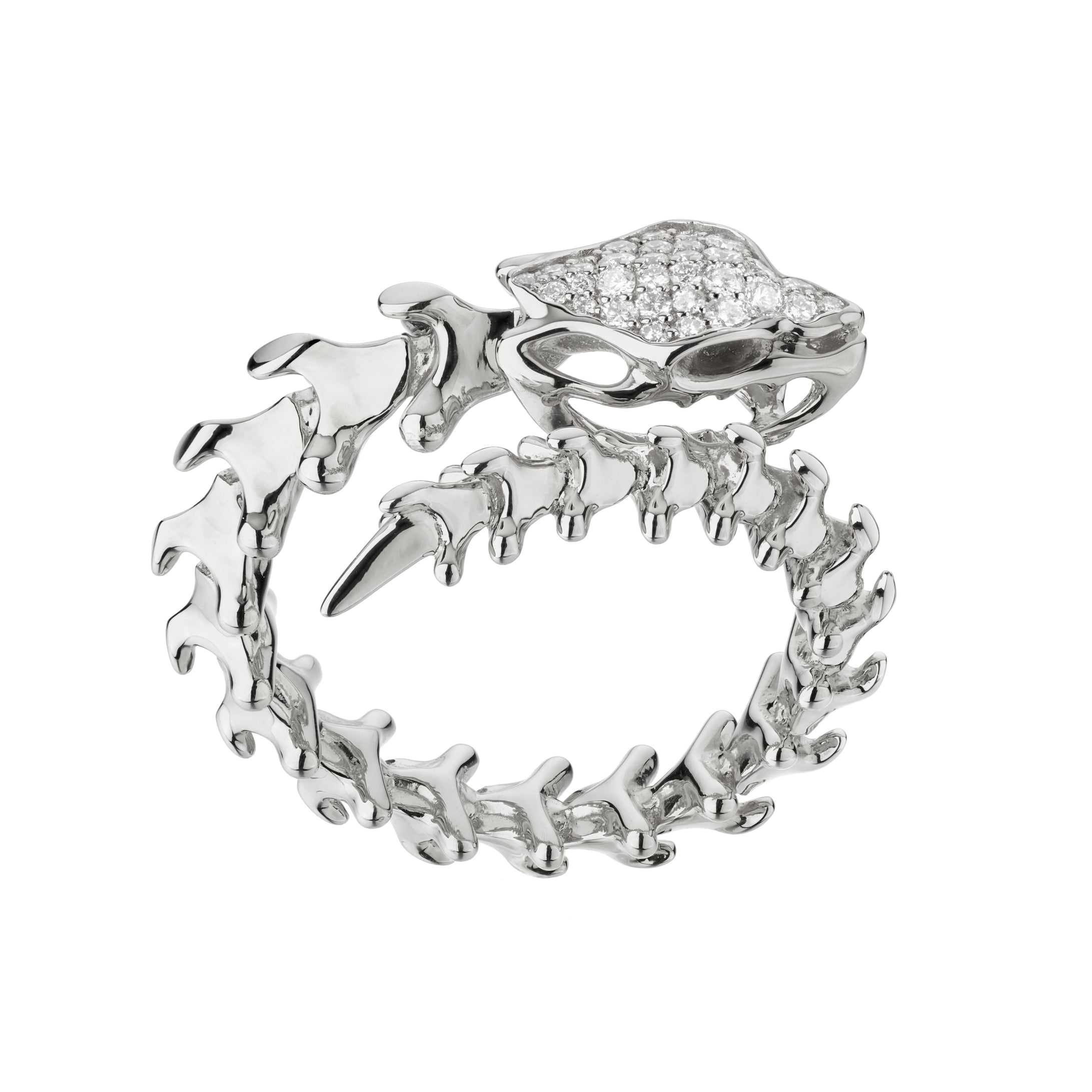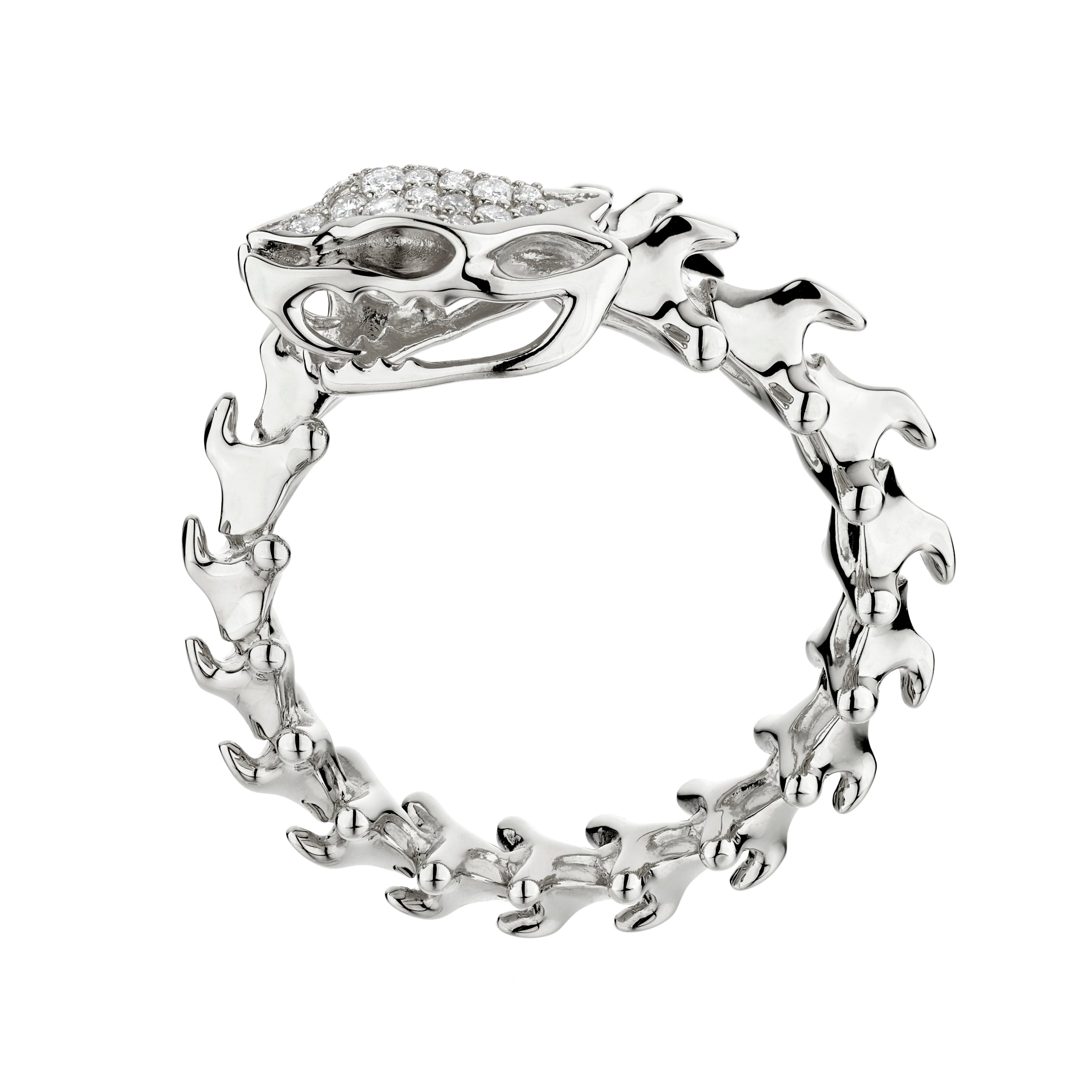 Handcrafted from sterling silver and brilliant white pave diamonds, our Serpent's Trace Wrap Ring captures the majestic beauty of the mythological serpent. Graduated sterling silver pieces of shaped bone effect the serpent undulating along your skin and across your knuckles, coiling the finger in a climb. A diamond-encrusted serpent's skull transforms this ancient creature into mythical legend. Our House code, Fauna, breathes life into organic silhouettes with a sensual touch - bedazzled, anatomical creations that embody the human experience. Tactile, playful, spot-lit with diamonds, our wrap rings stack harmoniously up your finger, bone to sterling silver bone. Cherish, adorn and raise your own brood.