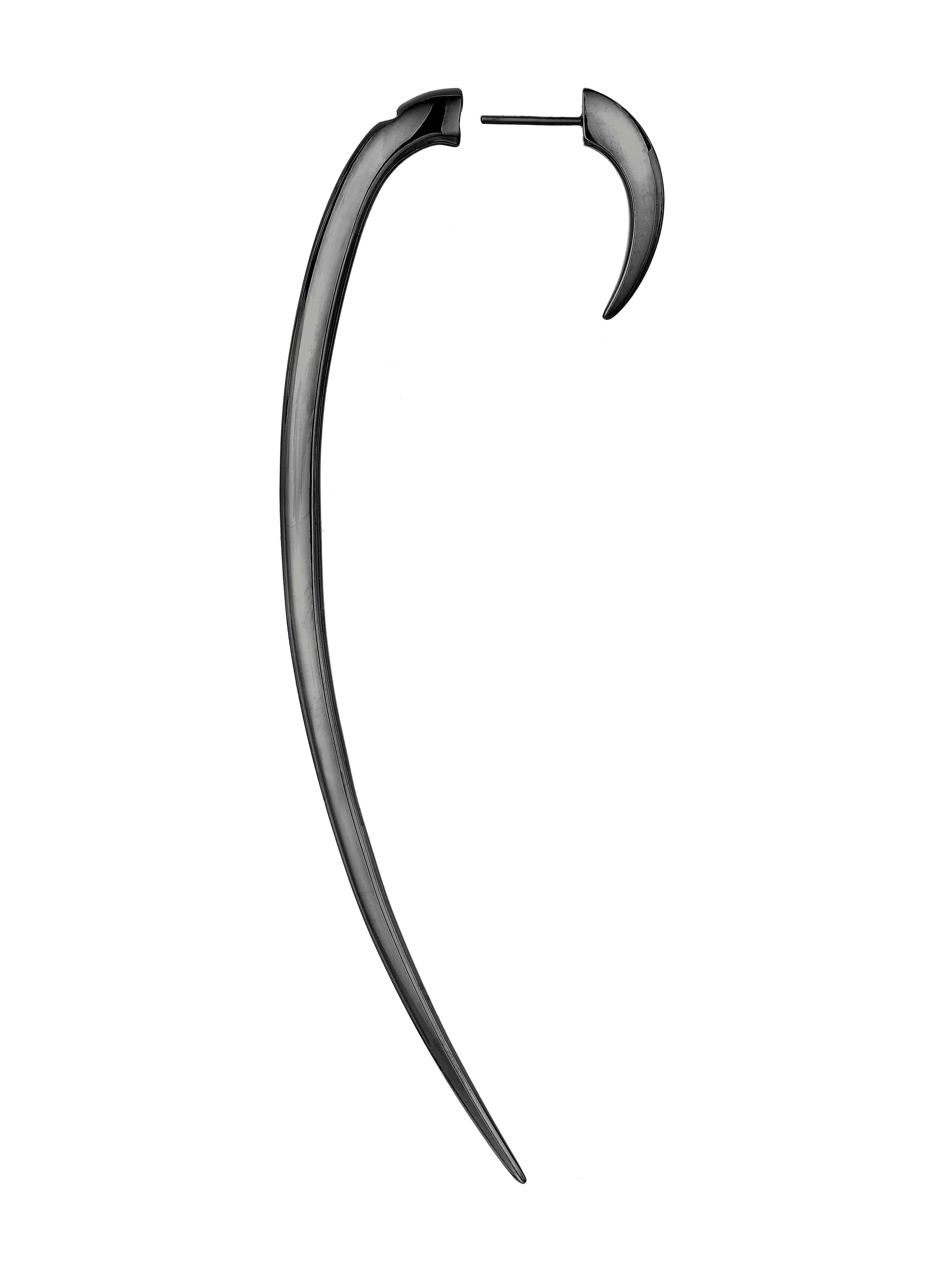 Untamed and mesmerising, The House's signature single black rhodium Hook Earring is an icon of design. Inspired by nature, sweeping precious curves form a sculpted silhouette that is defiantly primal and seductive.